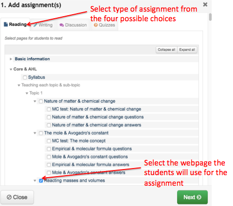 In this example a reading assignment on 'Reacting masses and volumes 'has been chosen.