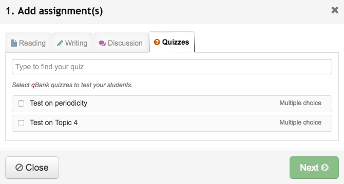 Note that if you click on 'Quizzes' then a list of all the quizzes available including any that you have already made and saved using qBank will pop up and you can choose which quiz you want as the assignment. By setting it as a quiz assignment the marks will automatically be transferred into your mark book whereas if you set a quiz page as a reading assignment students can answer the quiz and get it marked but the marks will not be added to your markbook.