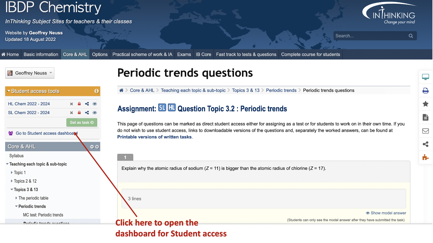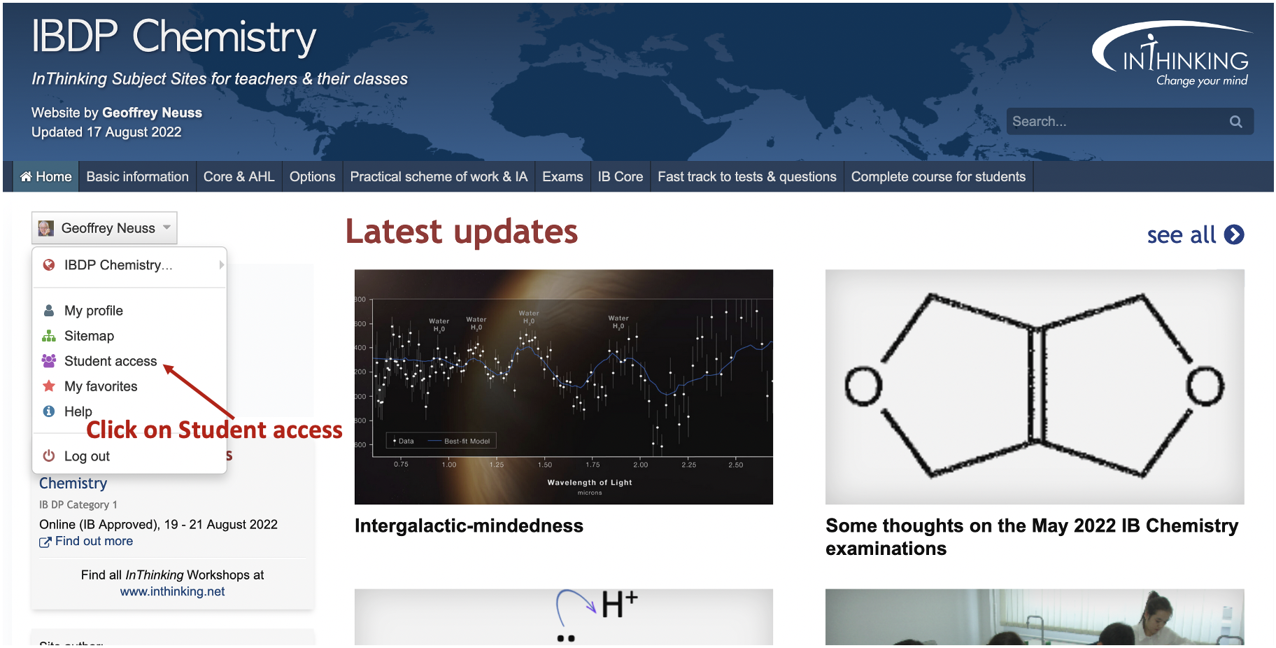 Note that you can gain student access from any non-teacher only page (not just the home page) simply by clicking on the arrow by your name and then selecting 'Student access' from the drop-down menu.