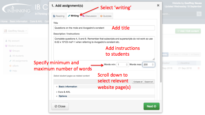 Set up the writing assignment by accessing your Group, then "Assignments" then "+Add assignment". Select "writing assignment" and complete the boxes. Note that you will need to add a minimum and maximum amount of words that your students can use. You may have to verbally tell them that they will not be able to use subscripts or superscripts when writing their answers so they would have to write sulfuric acid as H2SO4 and Avogadro's constant as 6.02 x 10^23 mol^-1 etc.
