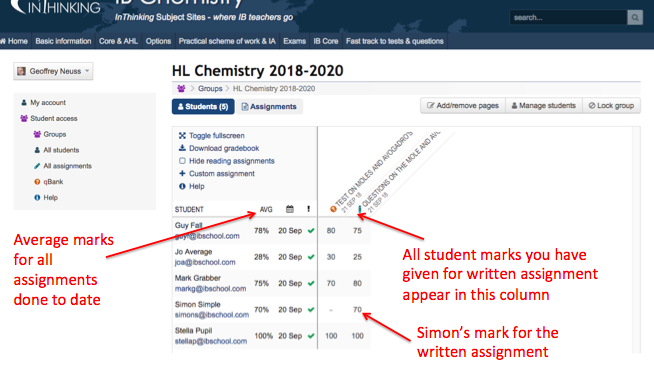 This shows all the marks for each student for the assignment and also the average mark for all the marked assignments to date.