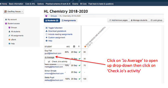 To monitor an individual student, click on their name (e.g. Guy Fall), then click on "student activity" from the drop-down menu.