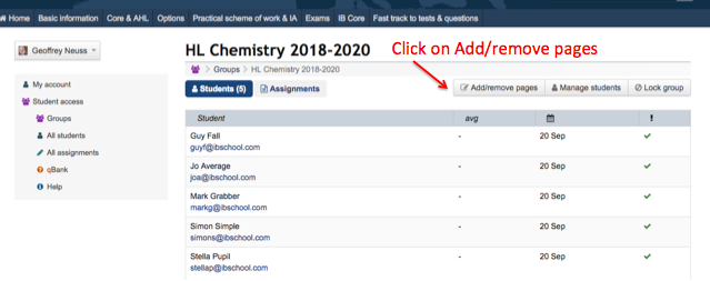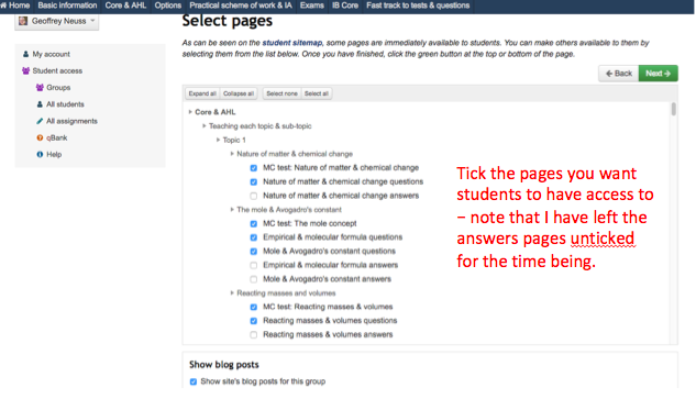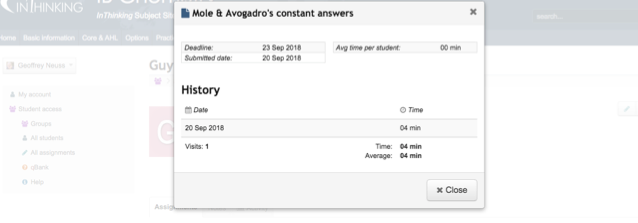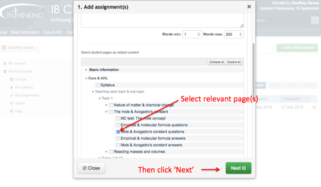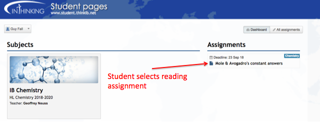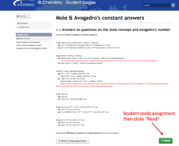 You may wish to give the students some pages just to read and, if you wish, you can monitor their actions. Most likely you will use this to give them access to the answers to short-answer questions after they have completed their written assignment. The answers are fully worked answers so they can learn from any mistakes they have made. If they still cannot understand where they have gone wrong then they can discuss with other students or ask you for help directly. For this example they will be provided with the answers to the short-answer questions on moles and Avogadro's constant that was set above as a writing assignment.