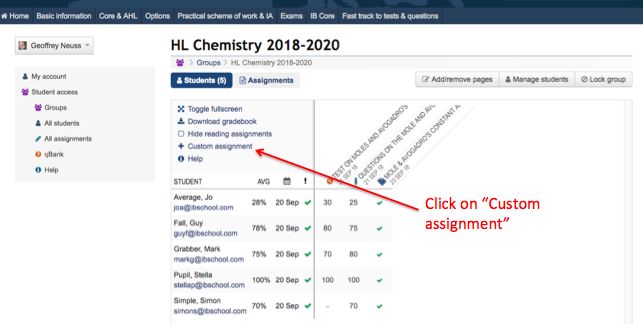 'Custom assignments' is a really useful facility to record marks in your mark book which have not come from automatically recorded assignments. For example they may be the results of tests, homework from questions not on this website or practicals etc. When you open up your mark book with the list of students in the group simply click on "Custom assignments".