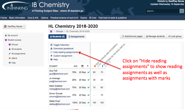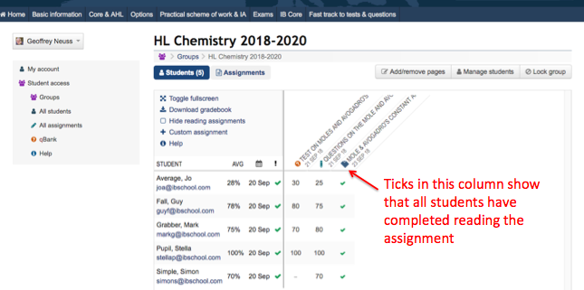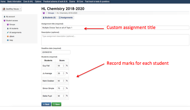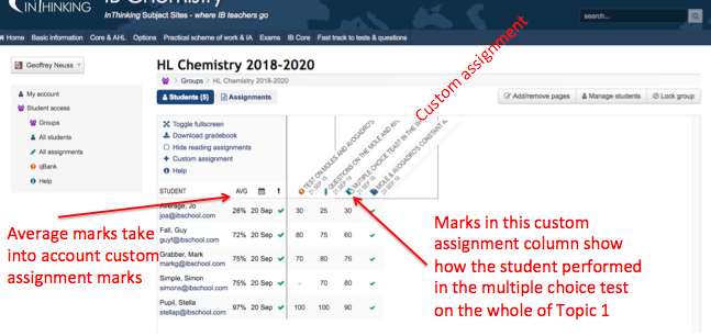 Let's suppose that after teaching Topic 1 you give your students one of the multiple choice tests on Topic 1 that can be found in Multiple choice tests for each topic. These are not the same as the quiz questions so are not recorded automatically. If you mark the test it is easy to record the mark for each student in the custom assignment.