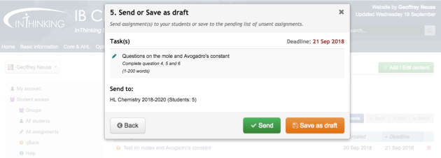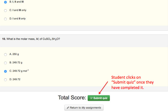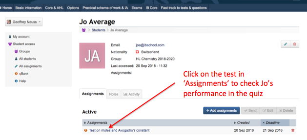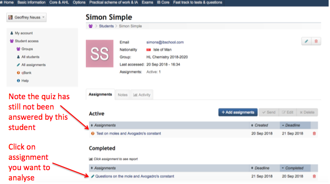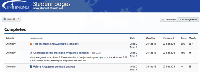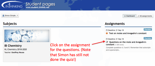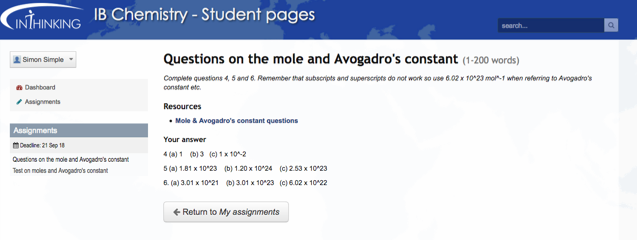 For chemistry you are most likely to use these when you want students to answer short-answer questions. You can of course just direct them to the question page and ask them to complete their written answers by a particular date. You would then have the option of collecting their answers in and marking them or simply providing them with the answers after the hand-in deadline and letting them correct their own work. However if you set it as an assignment you can monitor their work and also record the marks in your online mark book. Let's do this for some of the short-answer questions on the mole and Avogadro's constant.