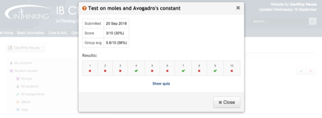 You can check the individual performance of any student by clicking on their name. For example, you may be concerned that Jo Average only scored 3 out of 10 (i.e. 30%) on this test. So click on Joe Average. This will produce a drop-down menu which you can then click on.