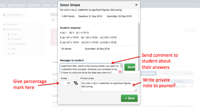 The teacher marks the assignment awarding it a percentage mark, writes any necessary comments to give feedback to the student as well as a private note to himself or herself if required, then clicks on "Send" and "Save" when completed.