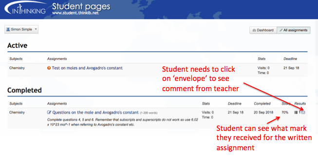Meanwhile each student can log onto their dashboard, click on "All assignments" and see what mark they received. If there is an envelope by the assignment they can click on it to see the feedback from the teacher.