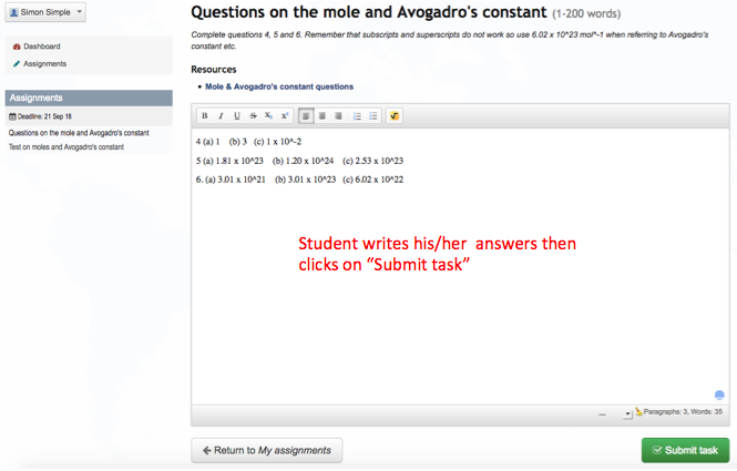 Each student finds the relevant webpage or resource with the questions, reads the instructions, writes his/her answers and then clicks on "Submit task".