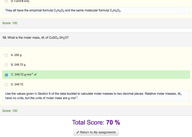 This will show the student whether or not they gave the correct or incorrect answer for each question and also gives the total score (as a percentage) which it will send automatically to the teacher. It also provides the explanation to each question whether or not the student got it correct (i.e. gave the best answer) or incorrect.