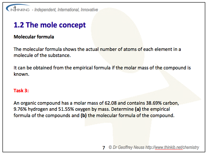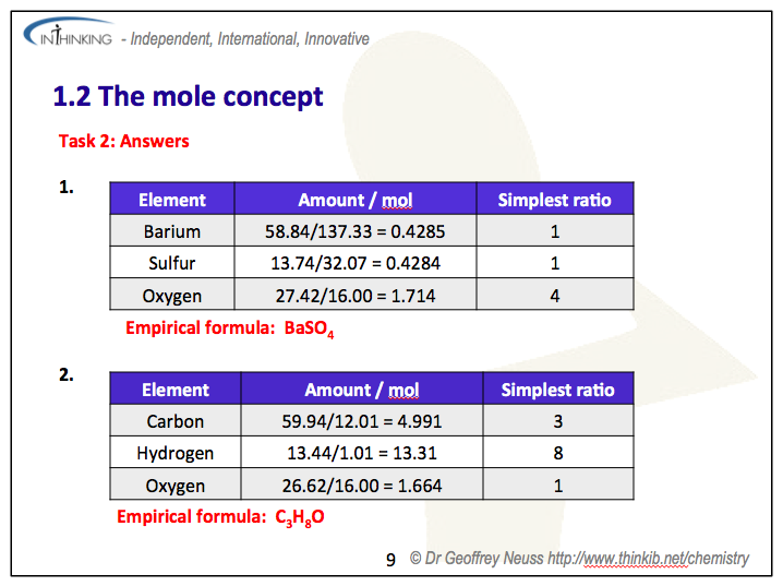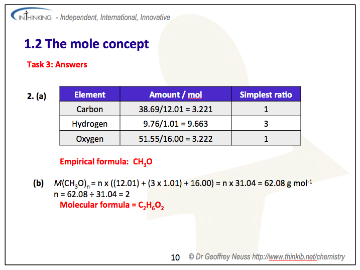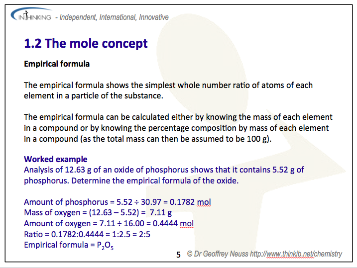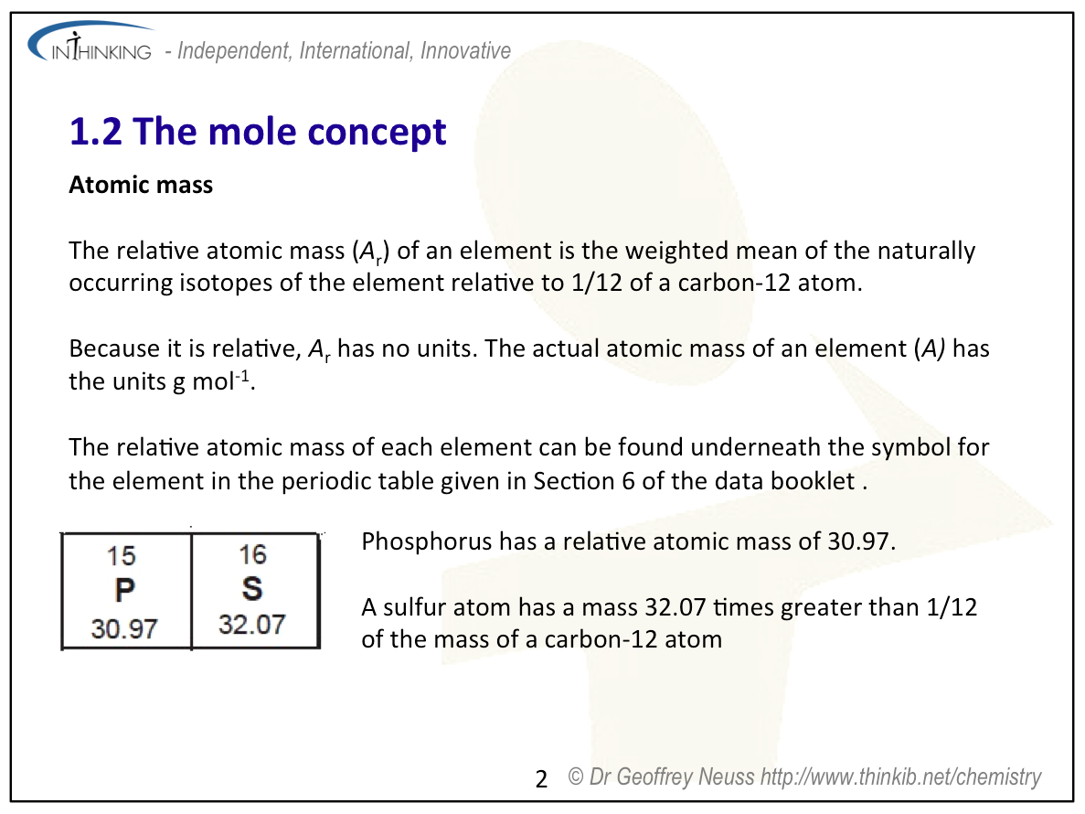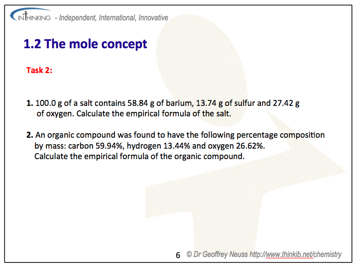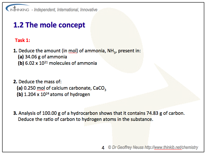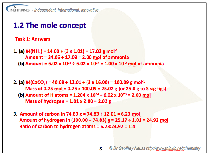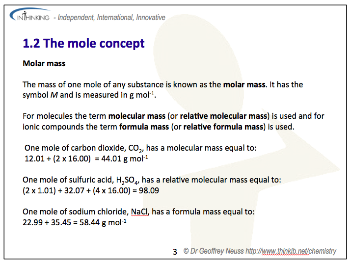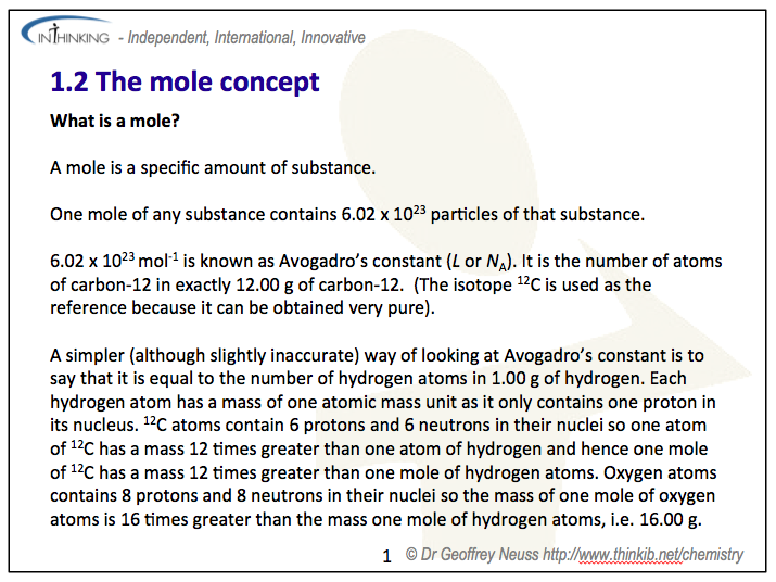 Written specifically for students to provide help and support for the IB Diploma chemistry programme this page provides full coverage of the syllabus content of Topic 1.2 The mole concept. It encourages you to think critically and provides many questions with full worked answers so that you can monitor and improve your knowledge and understanding.