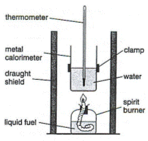 One of the best practicals you can do is to determine the enthalpy of combustion of a flammable liquid using a spirit burner underneath a beaker containing a known mass of water (see right). The experiment is fraught with problems such as incomplete combustion, heat loss and mass loss through evaporation when finding the mass of the burner before and after the combustion. However the calculations involved in determining the result cover this sub-topic well and the experiment also lends itself to a thorough and meaningful evaluation and a discussion as to how the experimental method could be improved. To do this thoroughly the literature ('accepted') value needs to be known so that the percentage error can be determined. The problem is "What is the literature value?"
