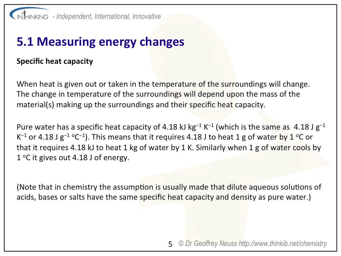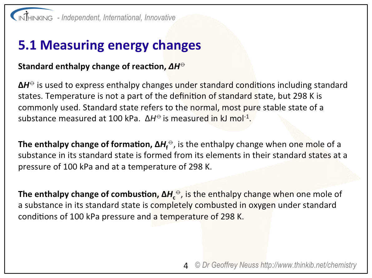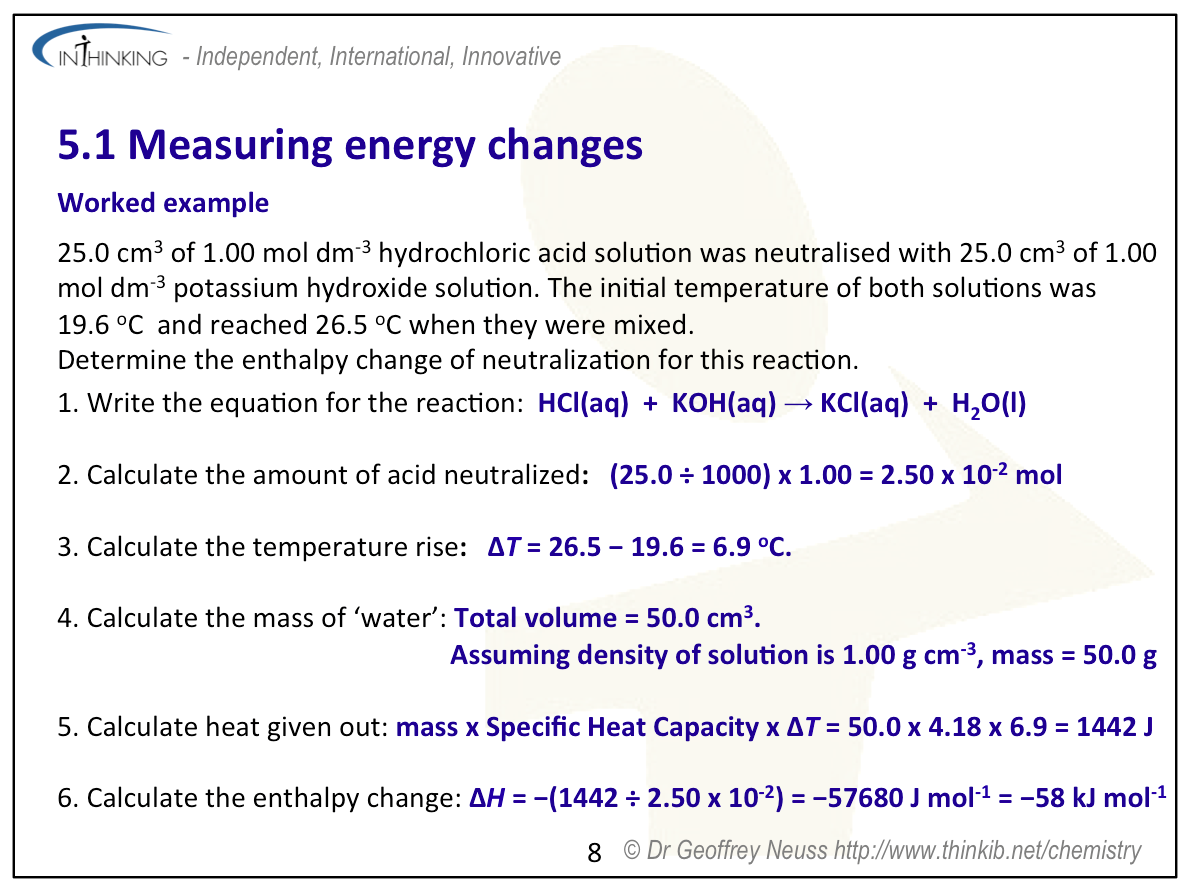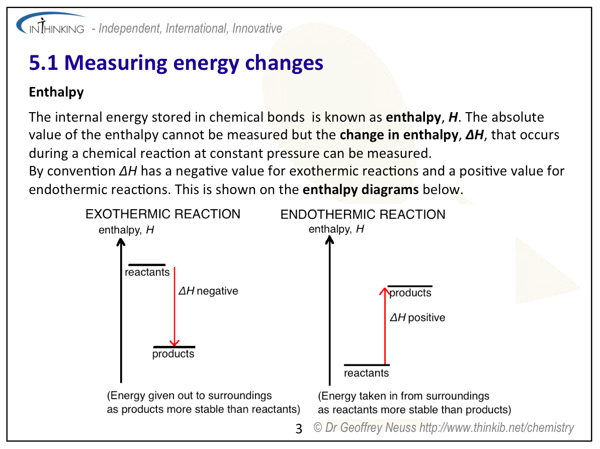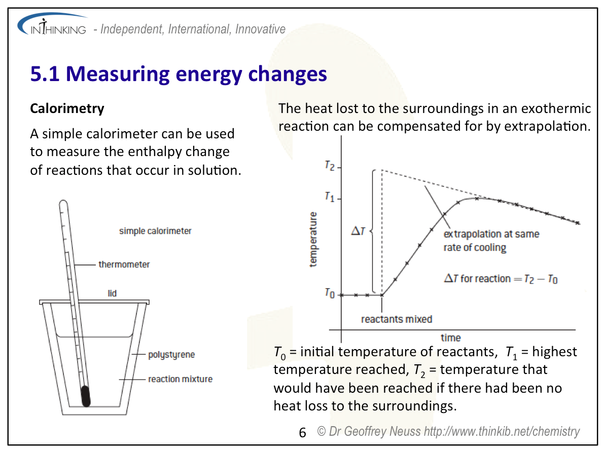 Written specifically for students to provide help and support for the IB Diploma chemistry programme this page provides full coverage of the syllabus content of Topic 5.1 Measuring energy changes. It encourages you to think critically and provides many questions with full worked answers so that you can monitor and improve your knowledge and understanding.