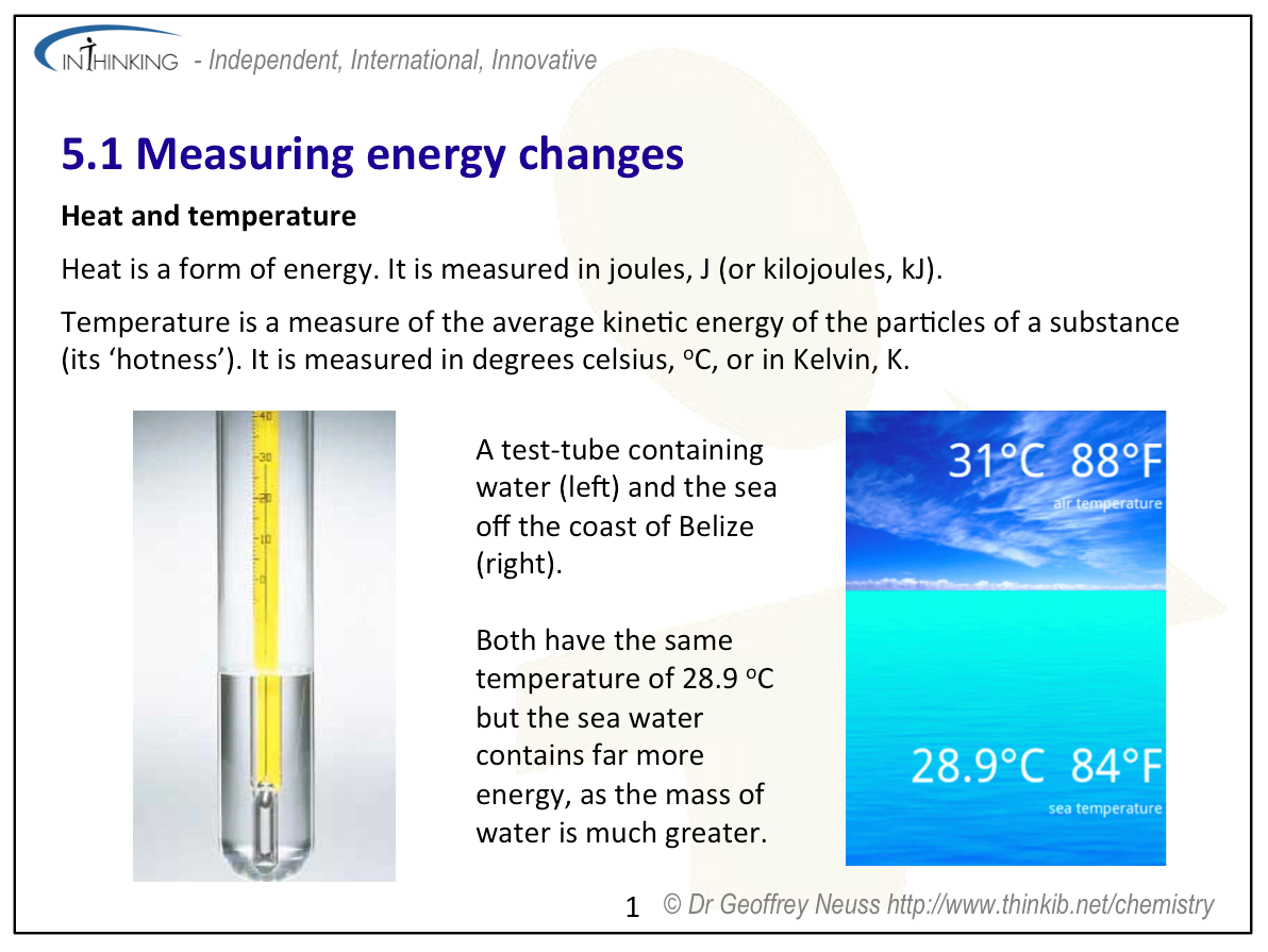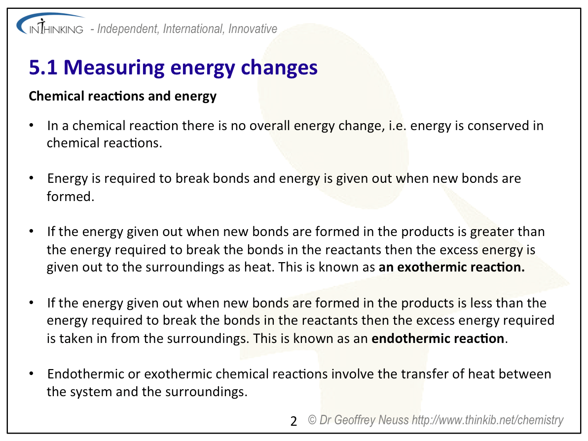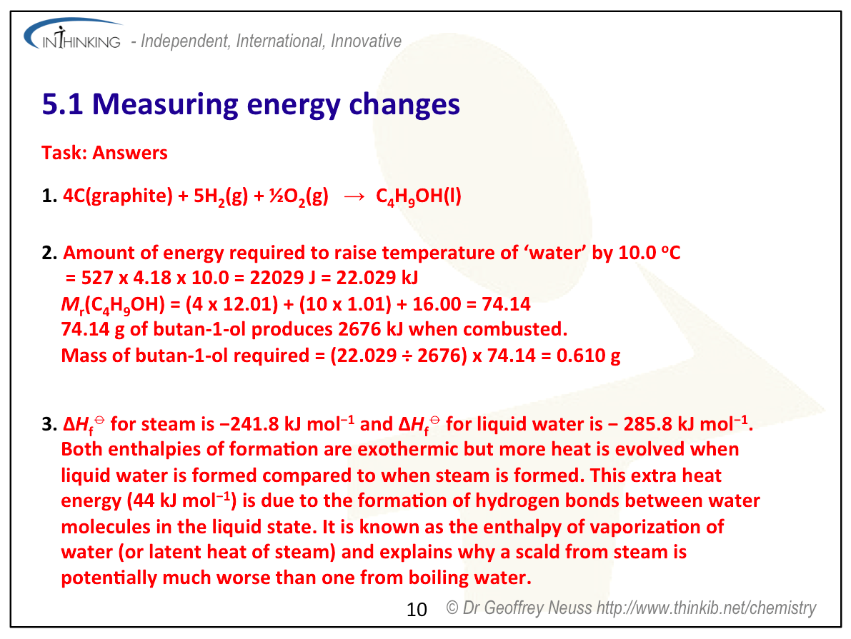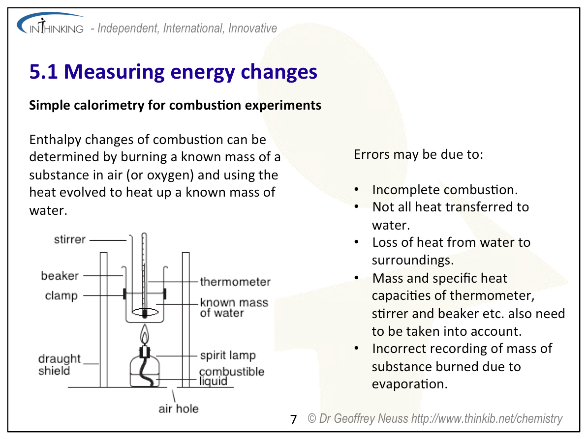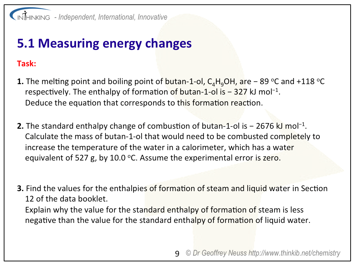 Written specifically for students to provide help and support for the IB Diploma chemistry programme this page provides full coverage of the syllabus content of Topic 5.1 Measuring energy changes. It encourages you to think critically and provides many questions with full worked answers so that you can monitor and improve your knowledge and understanding.