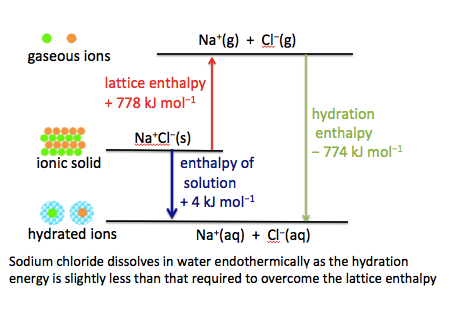 - Construct of energy cycles from hydration, lattice and solution enthalpy. Examples could include the dissolution of solid sodium hydroxide, NaOH(s), or ammonium chloride in water, NH4Cl(s), in water.
