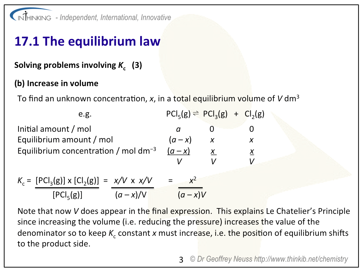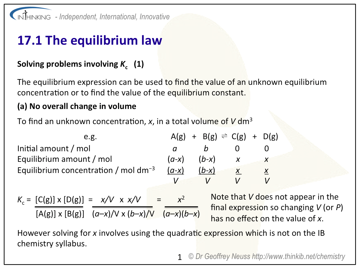 2. An example of a gaseous equilibrium calculation. Could be worth showing as the chemistry is very much on the IB syllabus but of course the mathematics for obtaining the final solution, which involves solving a quadratic equation, is not.
