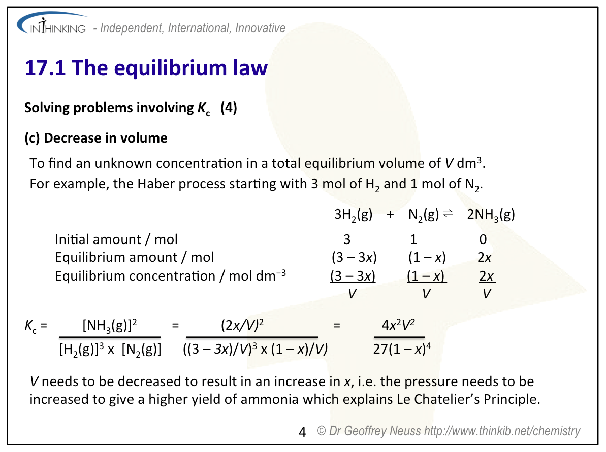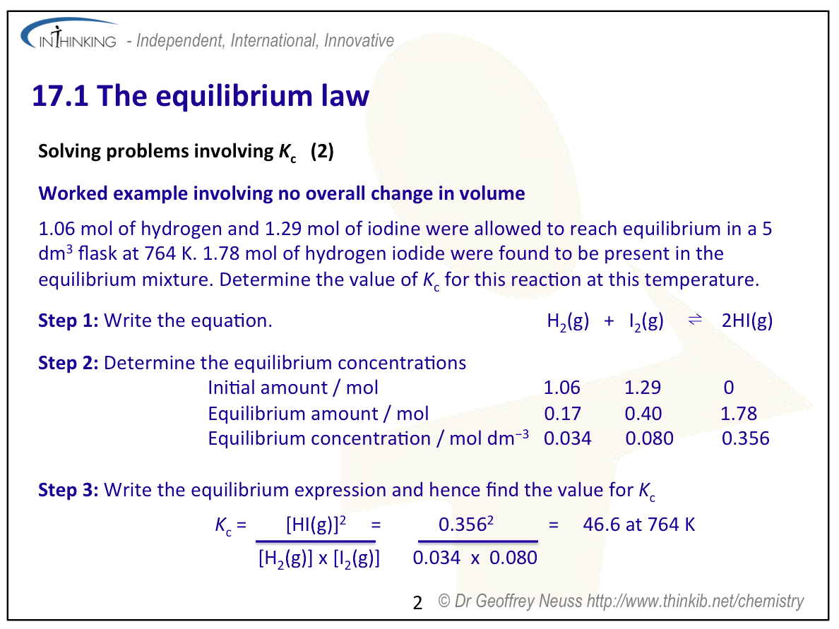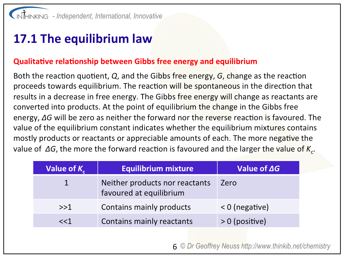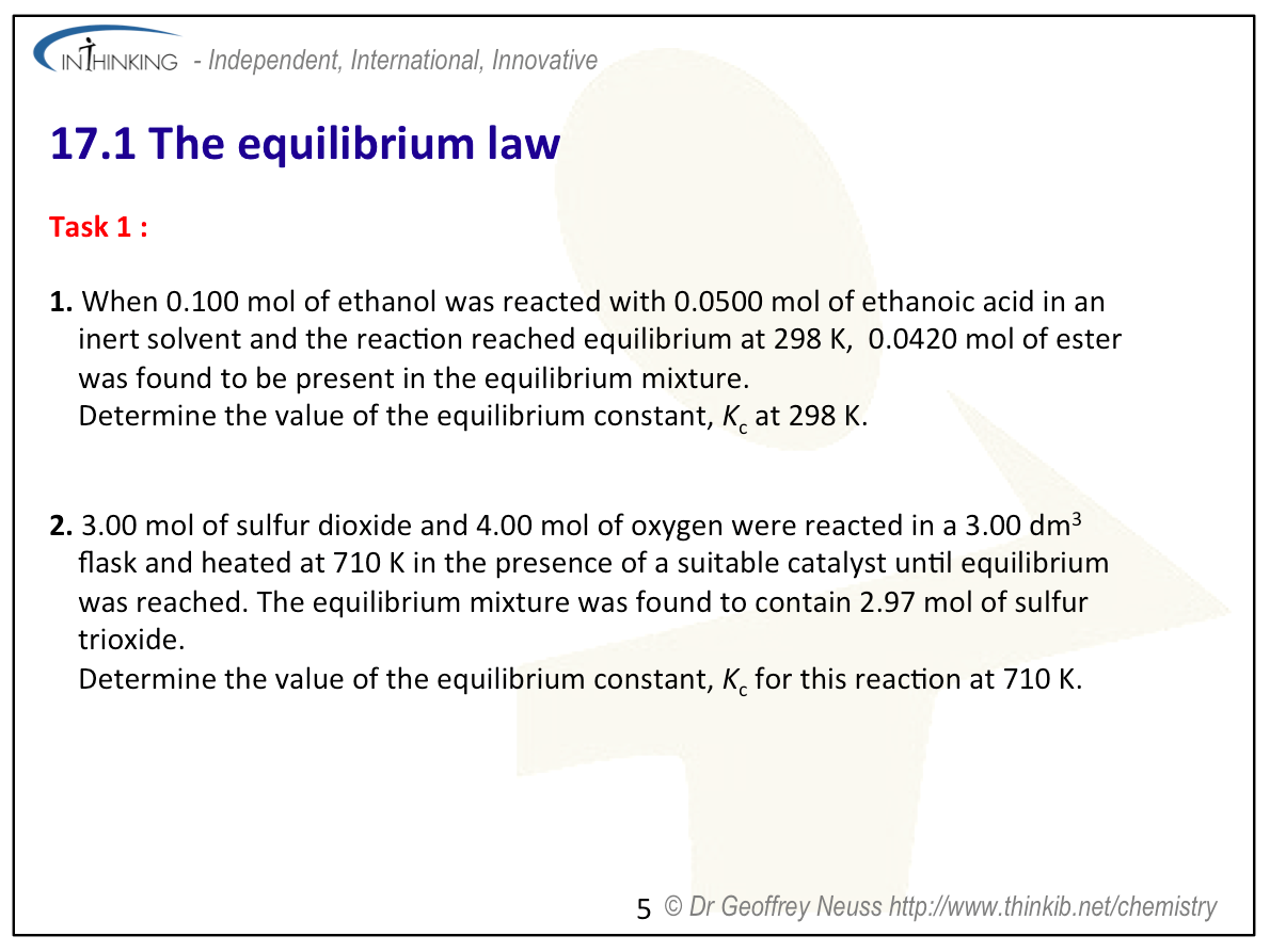 Written specifically for students to provide help and support for the IB Diploma chemistry programme this page provides full coverage of the syllabus content of Topic 17.1 Equilibrium law. It encourages you to think critically and provides many questions with full worked answers so that you can monitor and improve your knowledge and understanding.