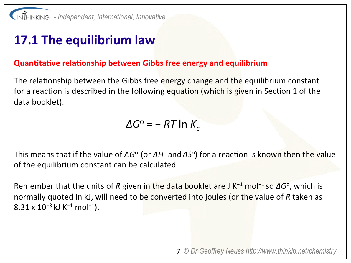 • Perform calculations using the equation ΔG = − RT ln Kc.