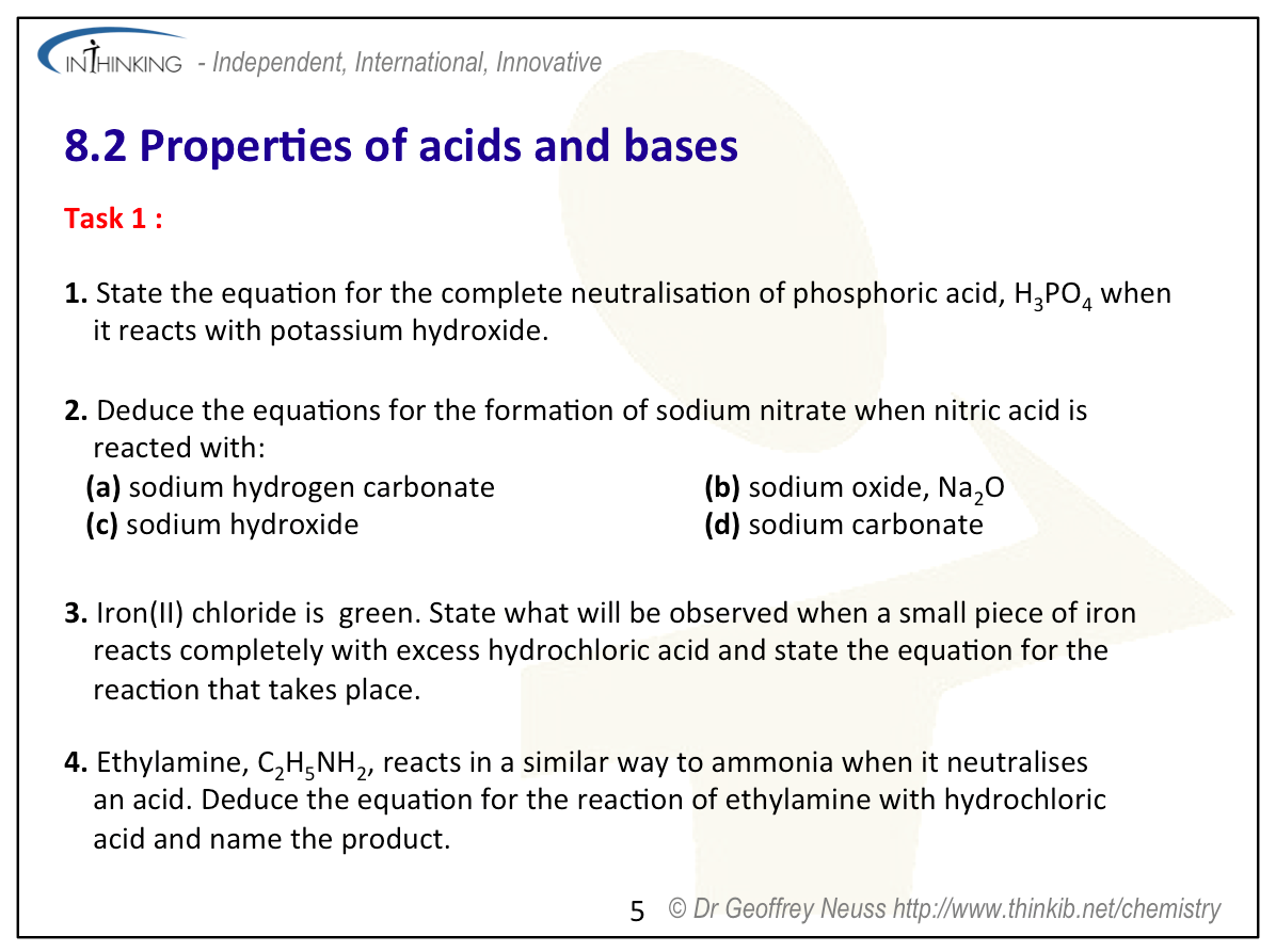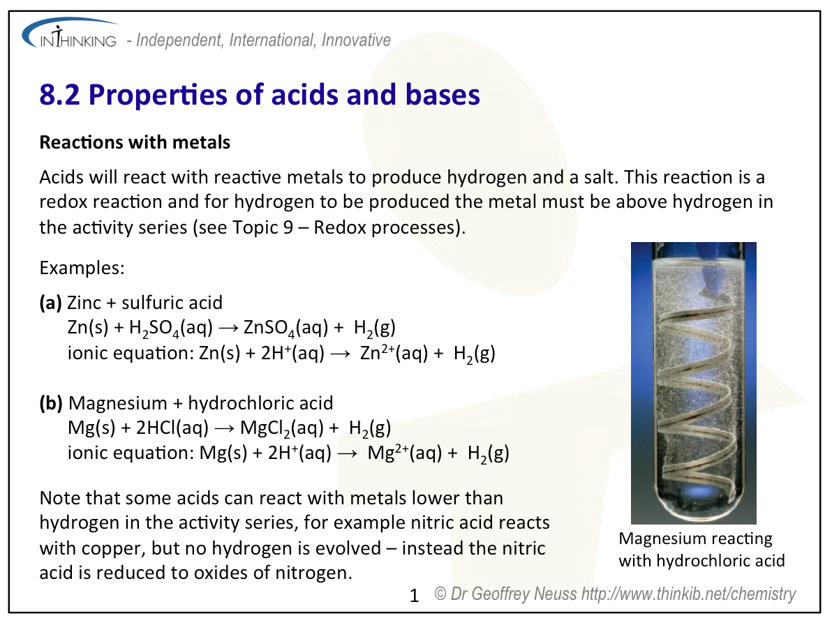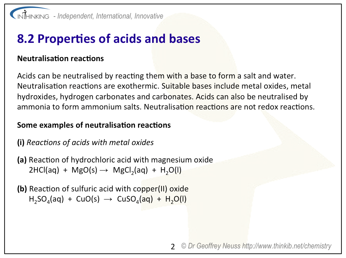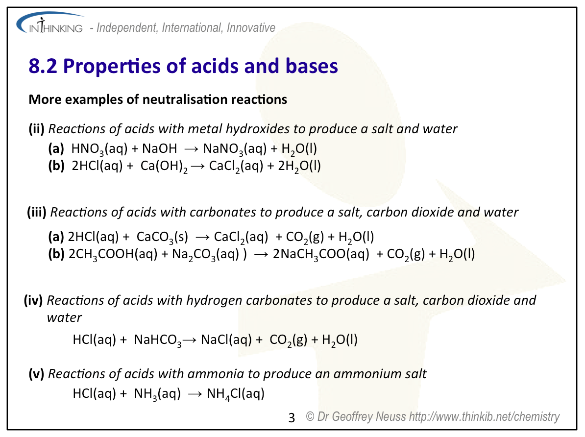 The characteristic properties of acids are generally well known. Reactions of acids with reactive metals, metal oxides, hydroxides, carbonates and hydrogencarbonates are all obvious examples. Other less obvious examples which are not technically on the IB programme are reactions with sulfides and sulfites. You should also know their characteristic reaction with acid-base indicators such as litmus, phenolphthalein, methyl orange and universal indicator. It is less obvious to list the characteristic properties of bases. Firstly a base needs to be defined and although the previous sub-topic, 8.1 Theories of acids & bases covered the Brønsted-Lowry definition I think what is meant here by a base is simply a substance that neutralises an acid. Consequently there are only three characteristic properties of bases: