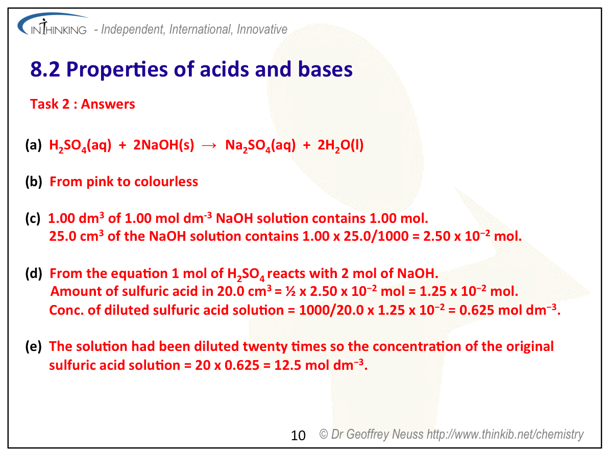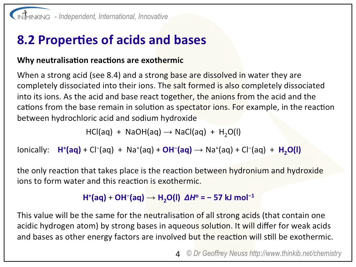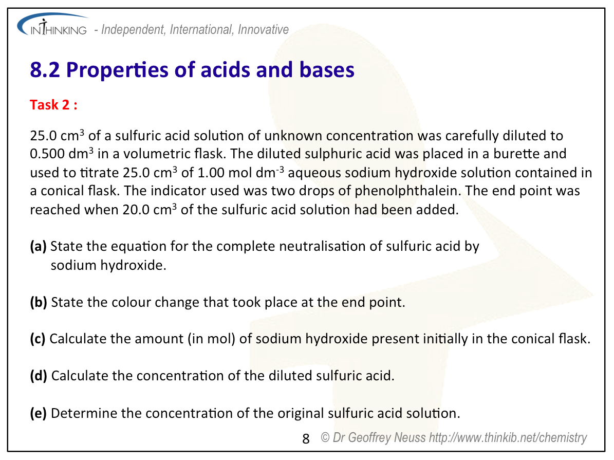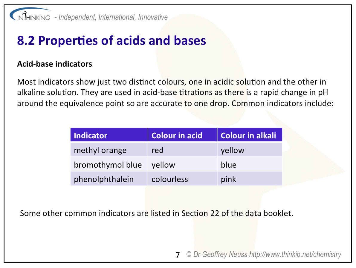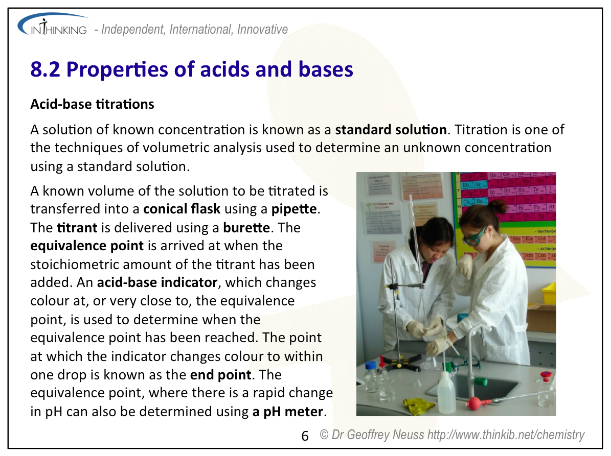 Written specifically for students to provide help and support for the IB Diploma chemistry programme this page provides full coverage of the syllabus content of Topic 8.2 Properties of acids & bases. It encourages you to think critically and provides many questions with full worked answers so that you can monitor and improve your knowledge and understanding.