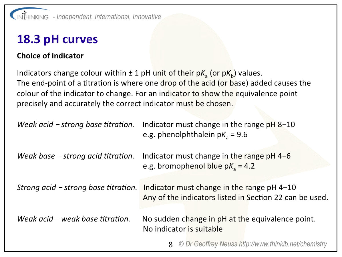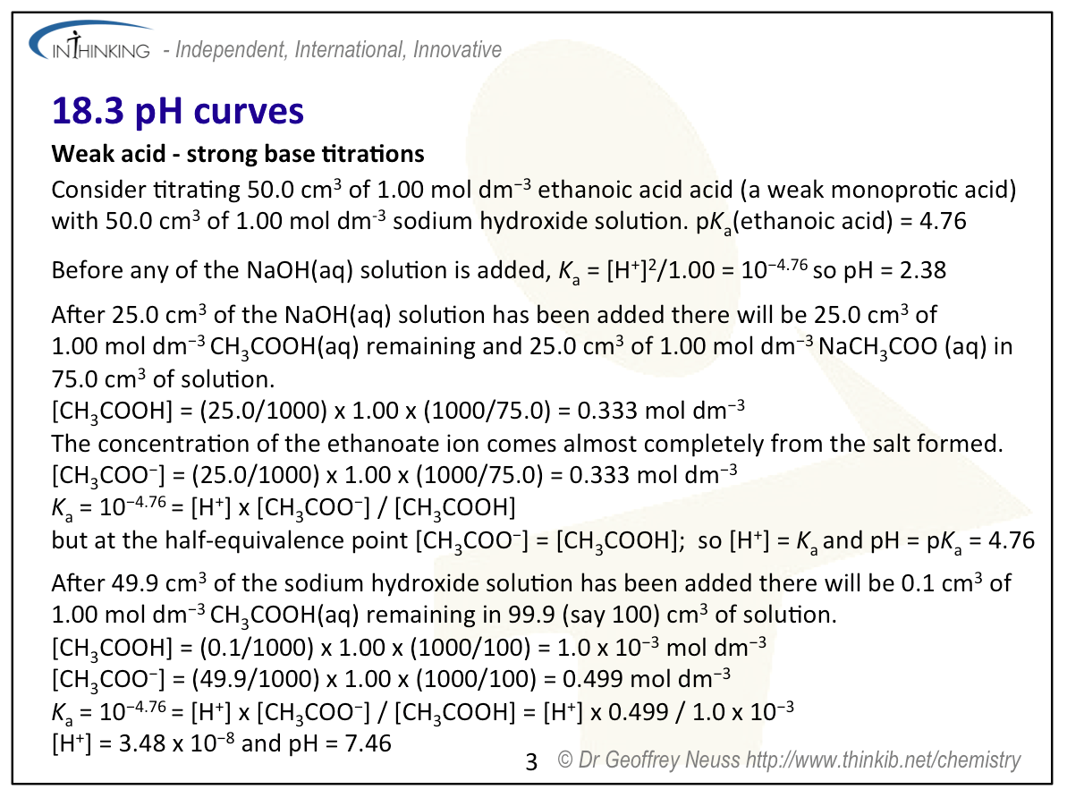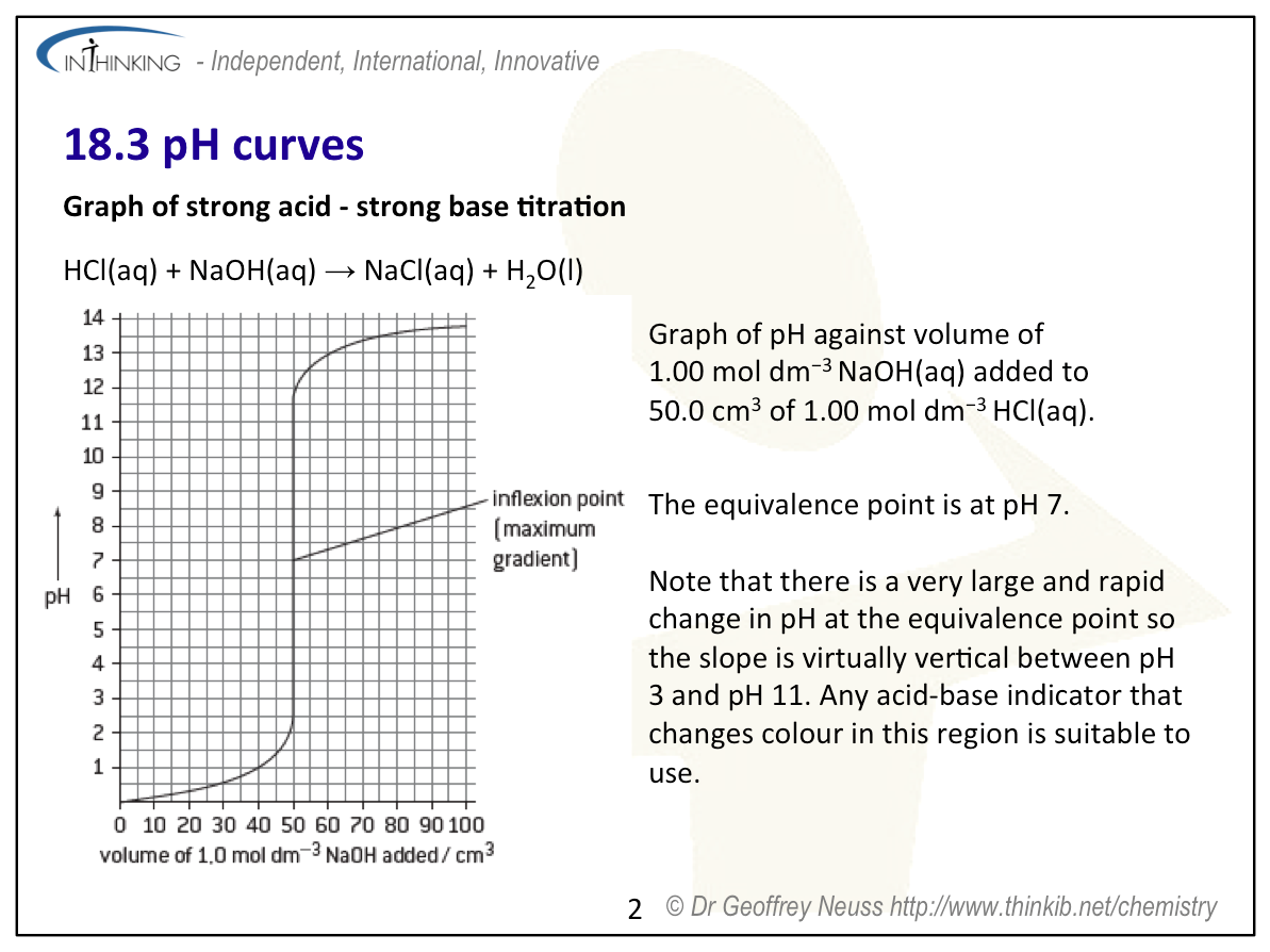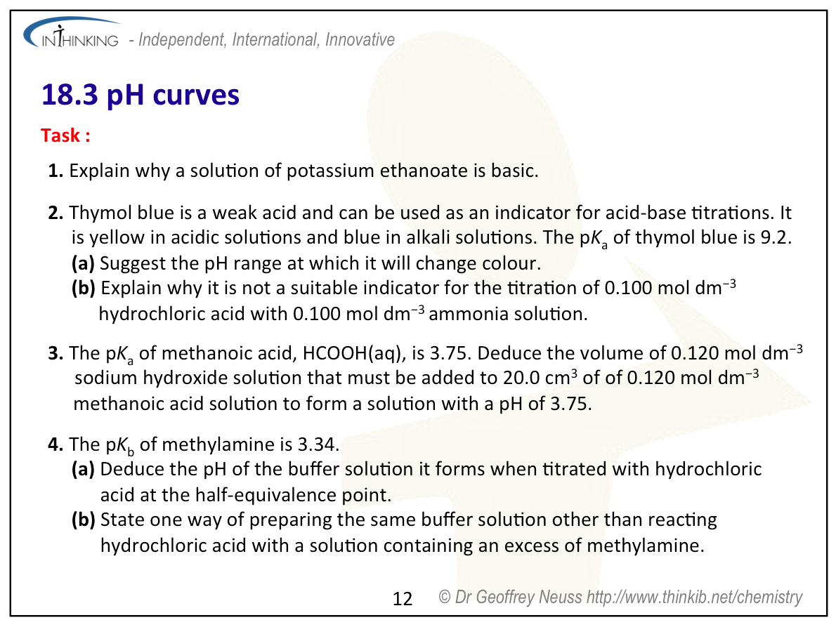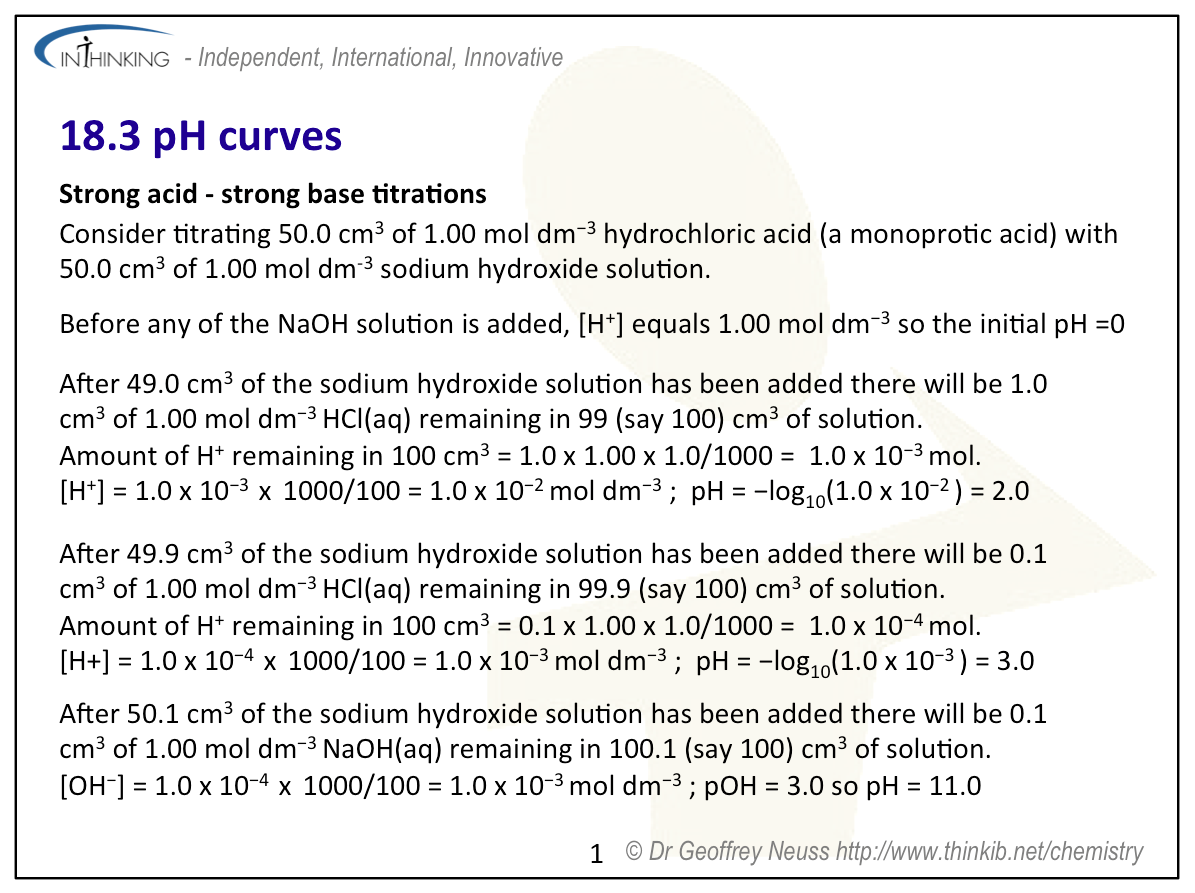 Written specifically for students to provide help and support for the IB Diploma chemistry programme this page provides full coverage of the syllabus content of Topic 18.3 pH titration curves. It encourages you to think critically and provides many questions with full worked answers so that you can monitor and improve your knowledge and understanding.