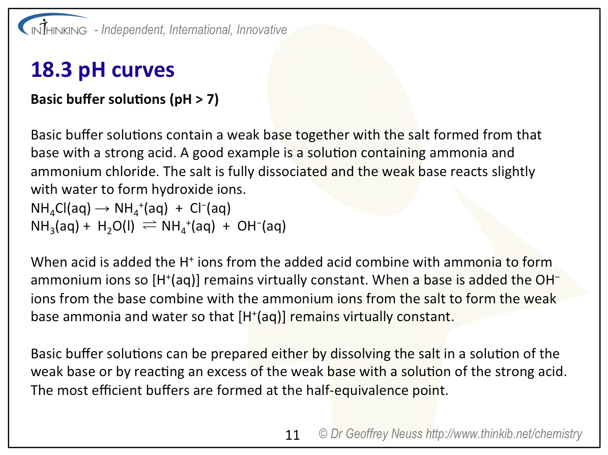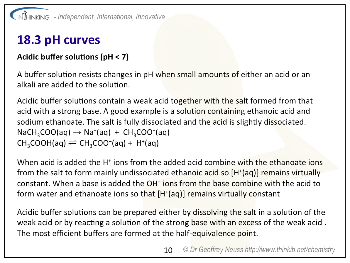 It can be difficult to know exactly what depth of knowledge and understanding is required. In 18.2 Calculations involving acids & bases it clearly states that you do not need to do buffer calculations and in this topic the half-equivalence point is not listed as one of the characteristics of a pH curve (although the point where pH = pKa is!). However not only do you need to understand about salt hydrolysis but you also need to know how the pH range of an indicator relates to its pKa value and be able to identify the buffer region on the pH curve as well as know how buffer solutions work and can be prepared. You also need to be able to explain pH curves. Whilst it is beyond the syllabus to ask you how to prepare a buffer solution with a specified pH value I think it is reasonable to expect you to be able to calculate the resulting pH when you know the concentration of both the acid (or alkali) and the concentration of the salt in a solution. This will enable you to see that the pH change is very rapid at the equivalence point (except for the case of a weak acid titrated against a weak base) and also enables you to work out that at the half-equivalence point (the centre of the buffering region) for a weak acid/strong base titration the pH is equal to the pKa of the weak acid. This will also help you if choose Option B: Biochemistry as your option where for one of the AHL sub-topics you do need to perform buffer calculations. If you are a Standard Level student then you do not of course need to study this AHL sub-topic but rather bizarrely if you opt to study Option D: Medicinal chemistry then buffer calculations do appear in the core of this option!