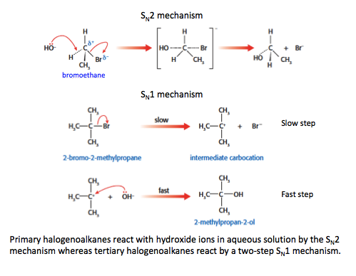 - Deduce the mechanism of the nucleophilic substitution reactions of halogenoalkanes with aqueous sodium hydroxide in terms of SN1 and SN2 reaction mechanisms.