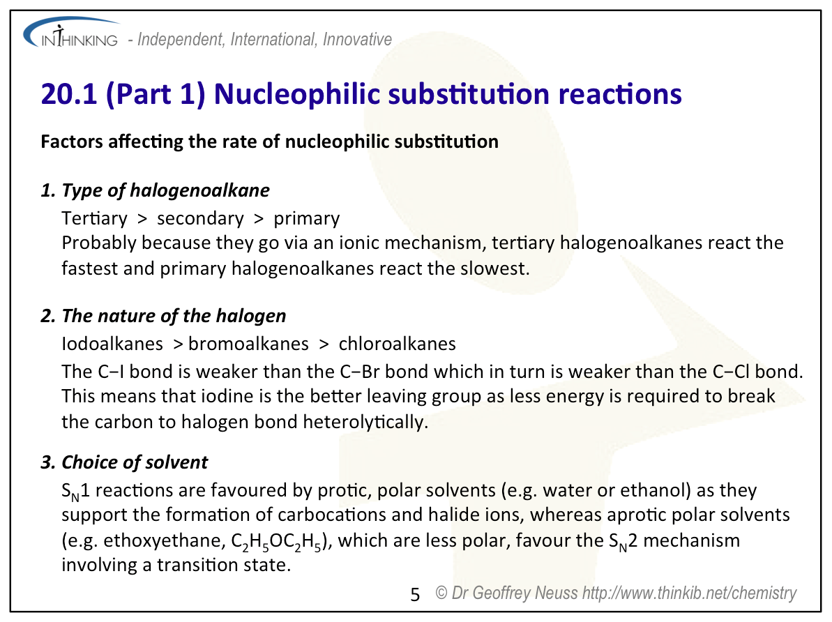 - Explain how the rate depends upon the identity of the leaving group (i.e. the halogen), whether the halogenoalkane is primary, secondary or tertiary and on the choice of solvent.