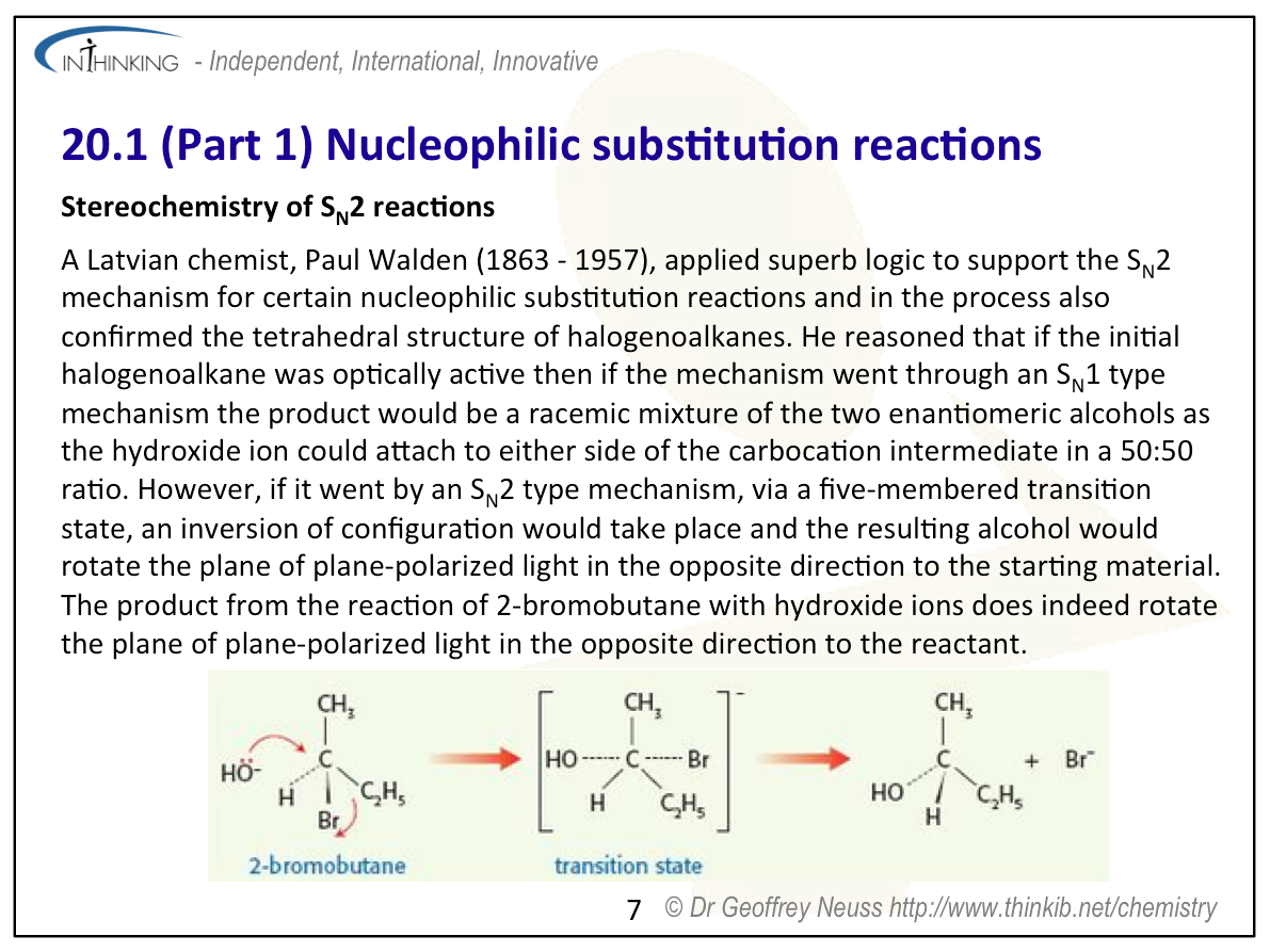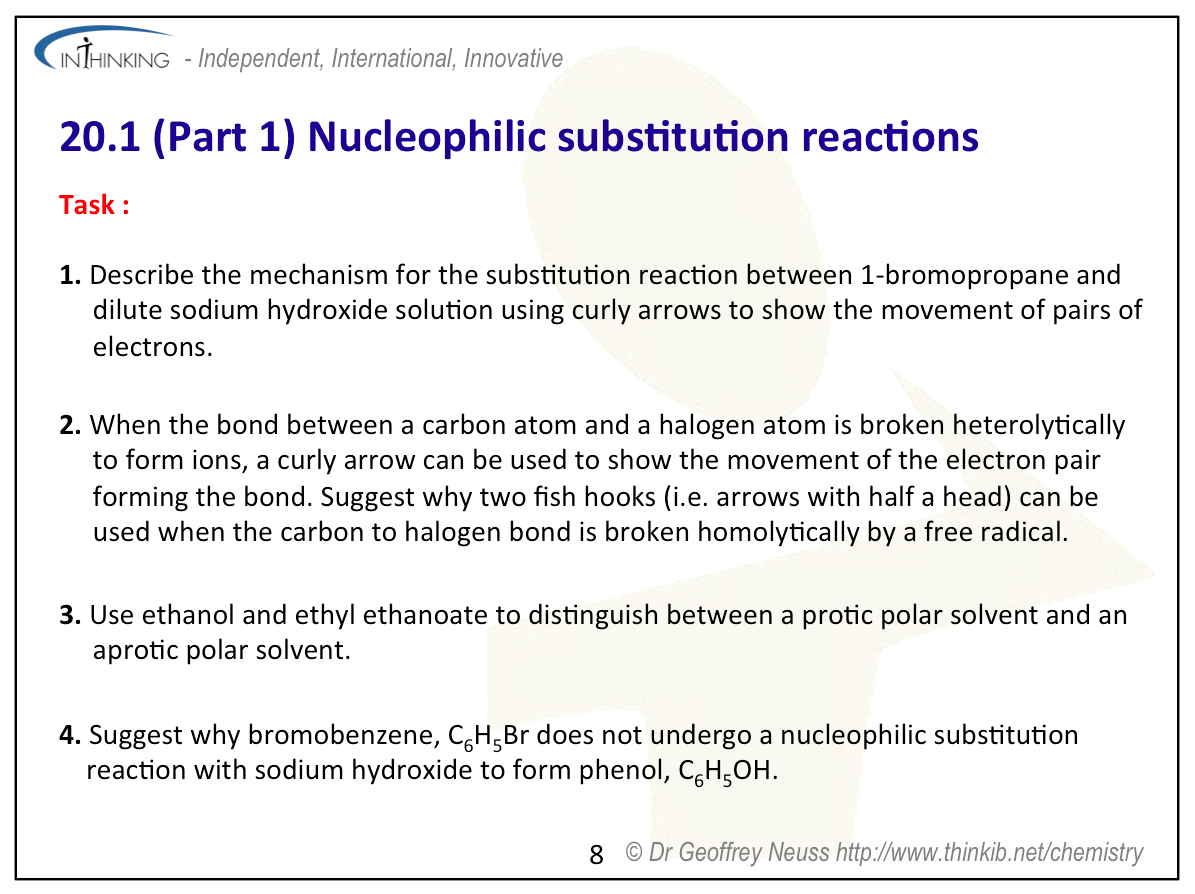 Written specifically for students to provide help and support for the IB Diploma chemistry programme this page provides full coverage of nucleophilic substitution, the first part of the syllabus content of Topic 20.1 Types of organic reactions. It encourages you to think critically and provides many questions with full worked answers so that you can monitor and improve your knowledge and understanding.