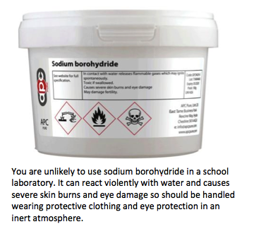 Both sodium borohydride and lithium aluminium hydride are white inorganic solids but you are not very likely to have 'hands on' experience of either of them in a school laboratory. Sodium borohydride can be used in the presence of a protic solvent such as water or ethanol so is relatively safe to use but if you do use lithium aluminium hydride practically in your school then it is wise to be alert to the potential risks associated with it. It can react violently with water and even reacts with the water vapour in the air.