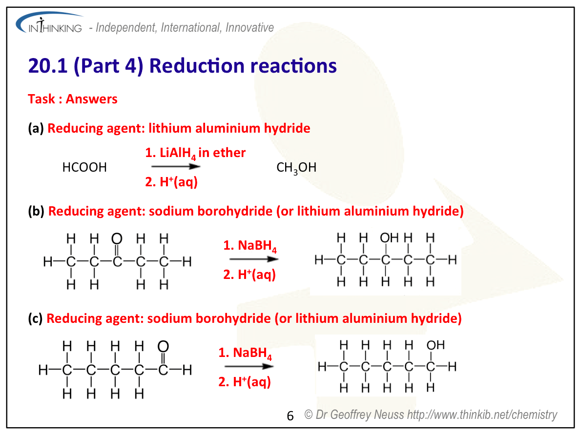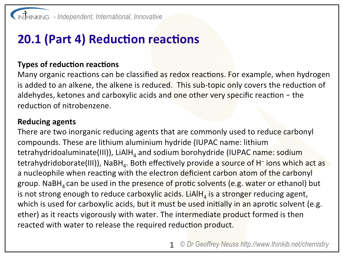 1. An interesting video which goes beyond the syllabus requirements to explain why lithium aluminium hydride is a stronger reducing agent than sodium borohydride. However you should be able to follow much of it as it is based upon the relative electronegativities of boron and aluminium.