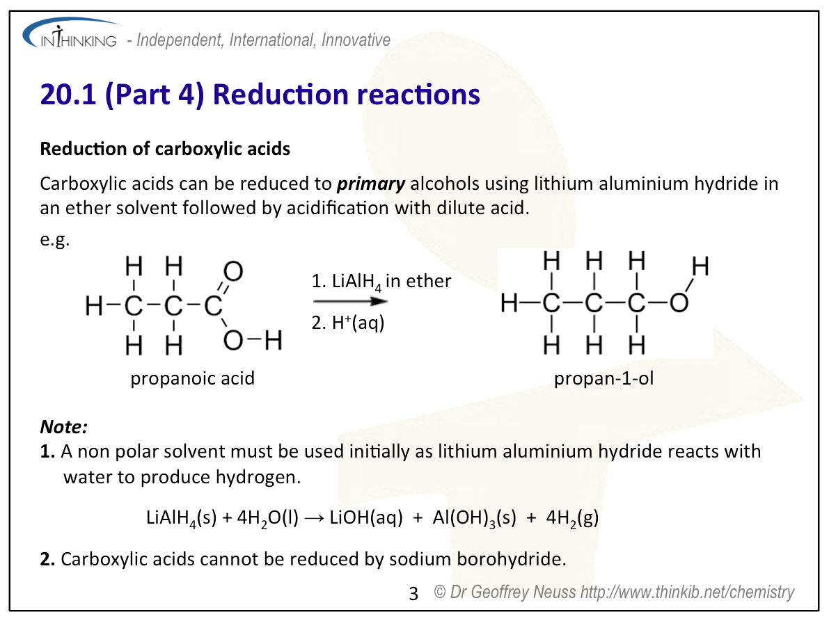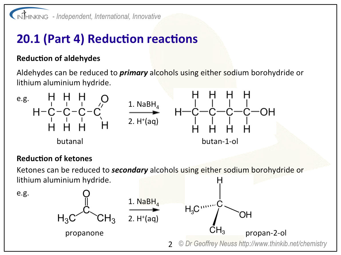 - Write equations for the reduction reactions of aldehydes to primary alcohols, ketones to secondary alcohols and carboxylic acids to primary alcohols, using suitable reducing agents.