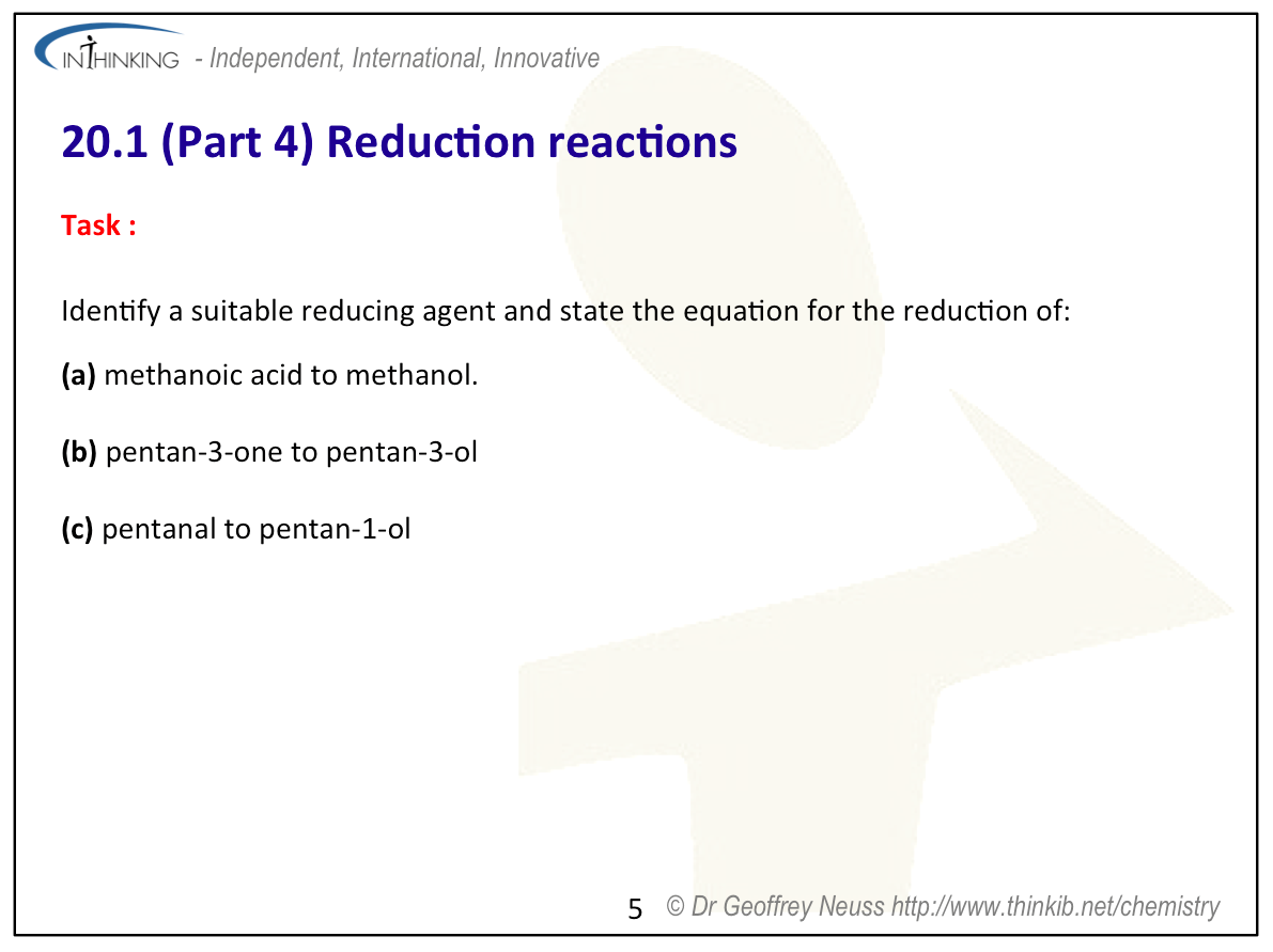 Written specifically for students to provide help and support for the IB Diploma chemistry programme this page provides full coverage of reduction reactions, the fourth part of the syllabus content of Topic 20.1 Types of organic reactions. It encourages you to think critically and provides many questions with full worked answers so that you can monitor and improve your knowledge and understanding.