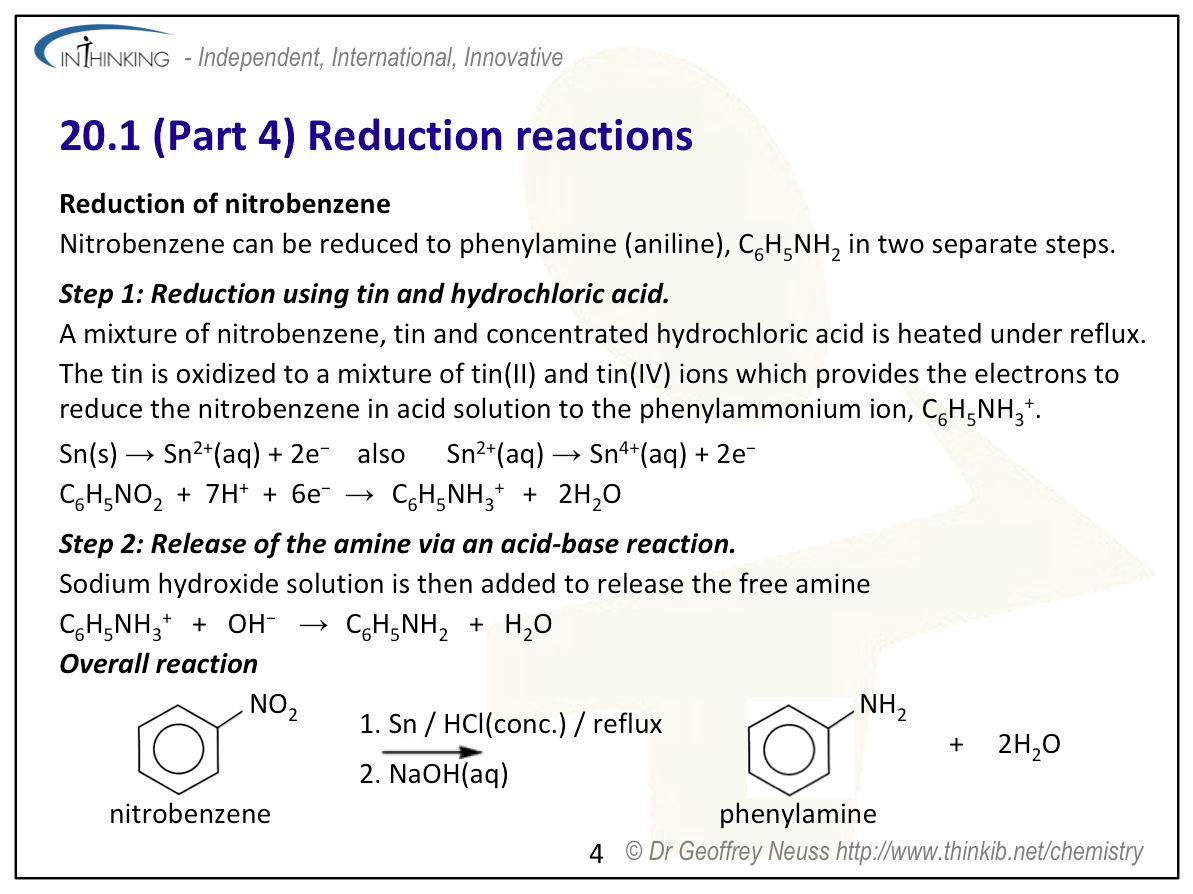One question you might ask is why the reduction of nitrobenzene is included in this sub-topic. This appears to be an isolated reaction which does not easily relate to any other chemistry on the syllabus except for the fact that the formation of nitrobenzene is given as an example of electrophilic substitution. The reaction is important as the product, aniline (and its analogues), is the precursor for the aniline dye industry (see Mauve: How One Man Invented a Colour That Changed the World in Books for enjoyment ). Aniline is also used in the production of polyurethanes and paracetamol is synthesised by reacting 4-aminophenol with ethanoic anhydride. However, as none of the reactions of aniline appears anywhere in the core. AHL or any of the options, the inclusion of the reduction of nitrobenzene seems to be just demanding the recall of factual information with no real purpose. I have given tin and concentrated hydrochloric acid as the reducing agent as it can be carried out practically in a school laboratory. It also fulfils the syllabus requirement of a two stage conversion but in fact nitrobenzene can also be reduced directly to phenylamine using hydrogen gas and a palladium or nickel catalyst at 200-300 oC.