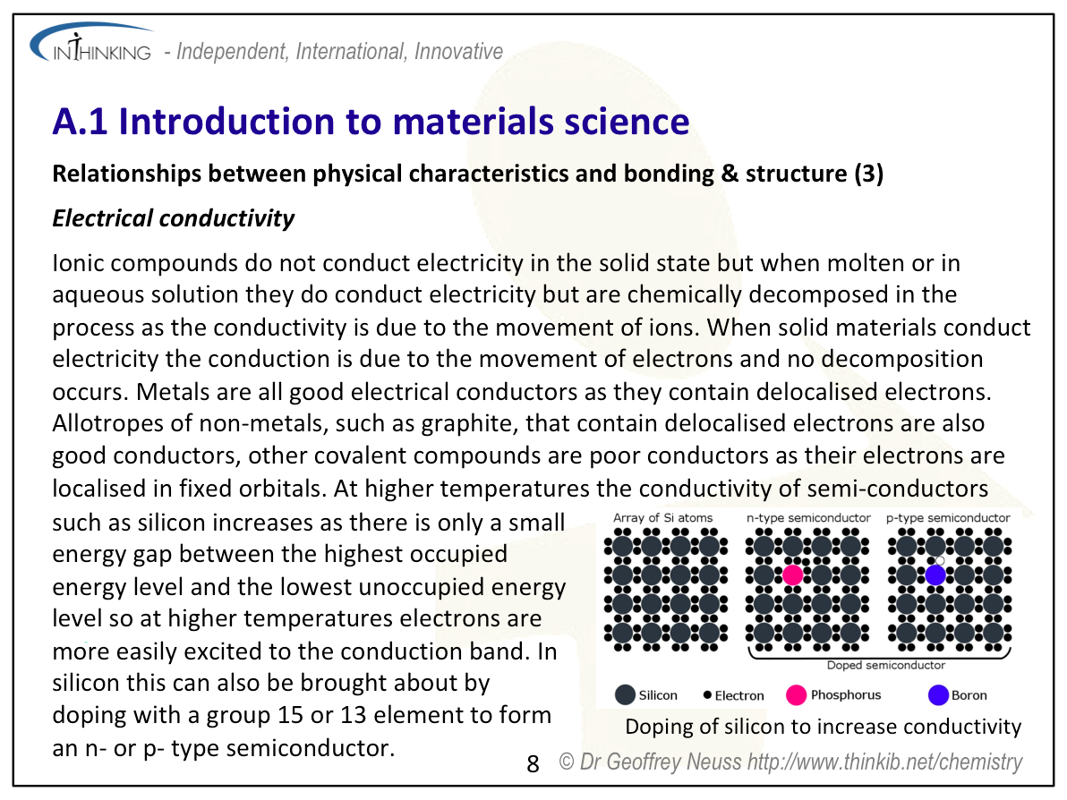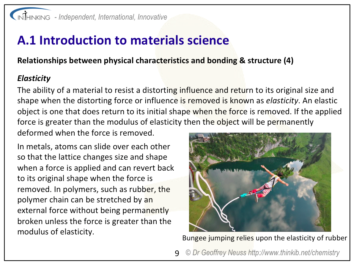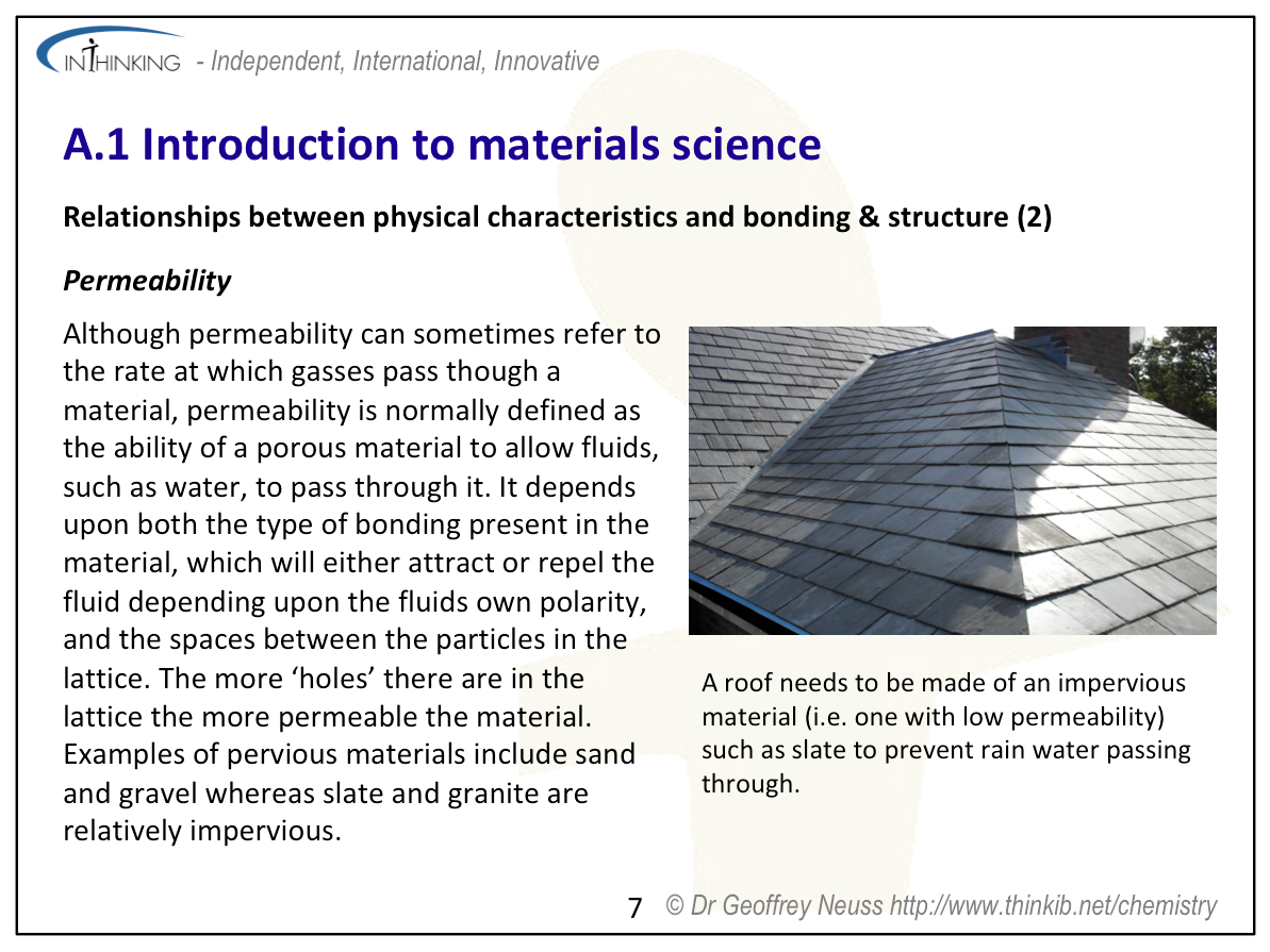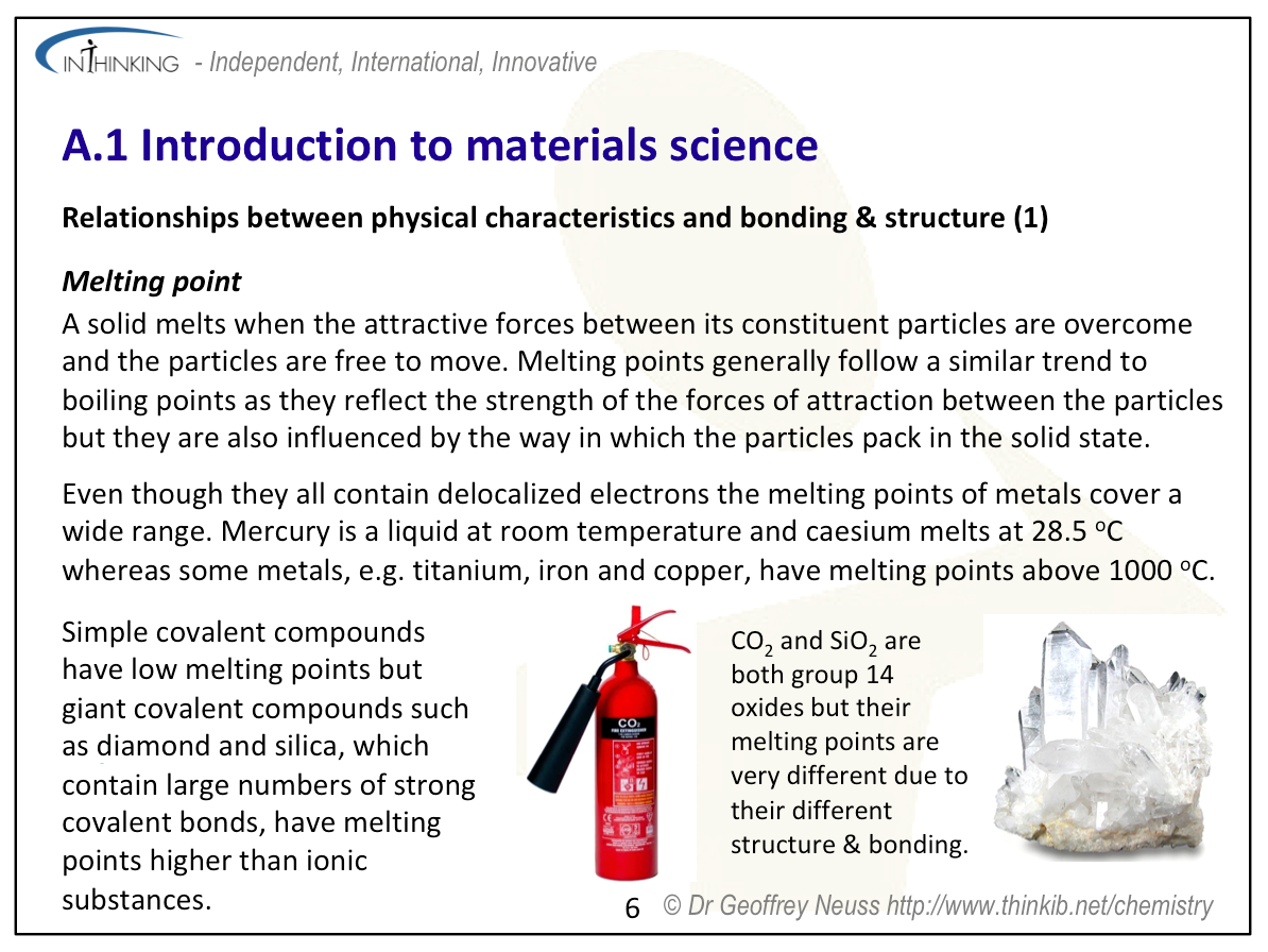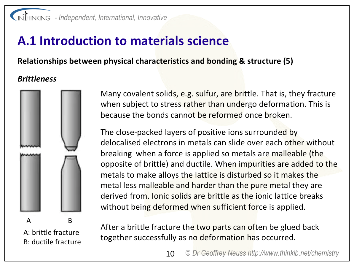 - Relate physical characteristics of a material (e.g. melting point, permeability, conductivity, elasticity and brittleness) to its bonding and structures (packing arrangements, electron mobility and ability of atoms to slide relative to one another).