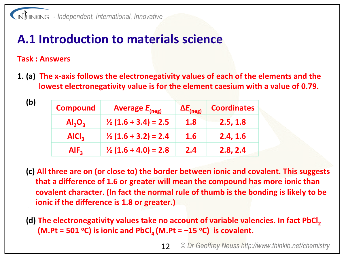 It is the first time that triangular bonding diagrams have appeared on the IB syllabus, although they have been on the Cambridge pre-U syllabus (another international examination for 16-19 year olds) for several years. I’m not convinced as to how useful they are. To me they do not really go much further than the old rule of thumb that if the electronegativity difference is greater than about 1.8 the compound is likely to be ionic. They remind me a bit of the octet rule. Both work for simple compounds but both are based on dubious assumptions and fail for more complex examples. Even if we can deduce the percentage of covalent to ionic bonding in a compound, does that really help to understand the properties? Metallic, covalent and ionic are nice labels and ways of classifying materials but their properties can only be generalised. For example metals “have high boiling points” but not all metals do – mercury is a liquid with an appreciable vapour pressure at room temperature. ‘‘Covalent substances have lower boiling points than ionic substances”– try telling that to diamond and sodium chloride!