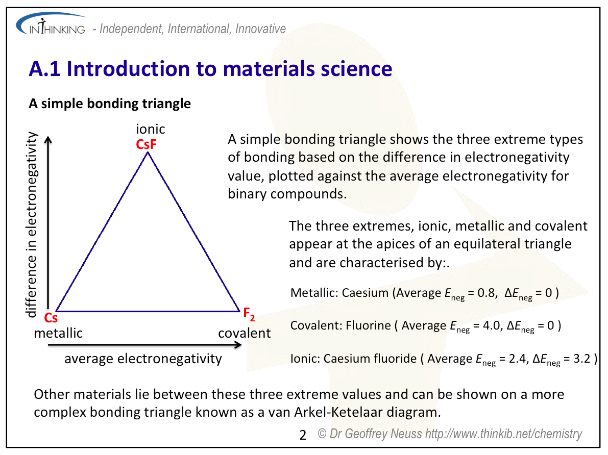 - The properties of a particular material can be deduced from its position on a bonding triangle which is based on the degree of covalent, ionic or metallic character in a compound