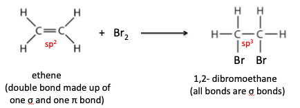 sp2 hybridization leads to a trigonal planar shape with a bond angle of 120o (e.g. alkenes, ketones, aldehydes CO32−) and sp hybridization leads to a linear shape with a bond angle of 180o (e.g. alkynes, HCN).
