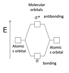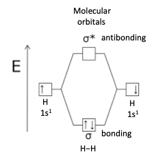 This can be used to explain the bonding in hydrogen. Each hydrogen atom contains one electron in an s orbital. When two hydrogen atoms are brought into contact with each other the orbitals combine to give the two molecular orbitals, each of which can contain two electrons.