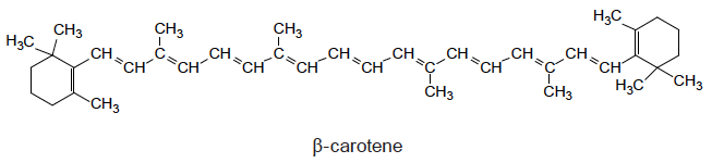 The gallery then goes on to explain the structure of benzene (Slide 5). Delocalization will occur whenever there are alternate C=C and C−C bonds as each of the carbon atoms will be sp2 hybridized so the electrons in the resulting π bonds can be spread over all the bonds equally. This results in an increase in electrical conductivity. The electron transition between the bonding and non-bonding orbitals is of lower energy in compounds containing much delocalization (also known as conjugation) than those where the bonding is localized. Hence when they are excited highly conjugated compounds tend to absorb light at a lower wavelength than compounds containing just localized bonds resulting in coloured compounds. Examples of highly conjugated molecules include porphyrins and carotenes (see for example the structure of β-carotene given below and the structures of chlorophyll, heme and α-carotene given in Section 35 of the IB data booklet).