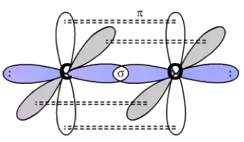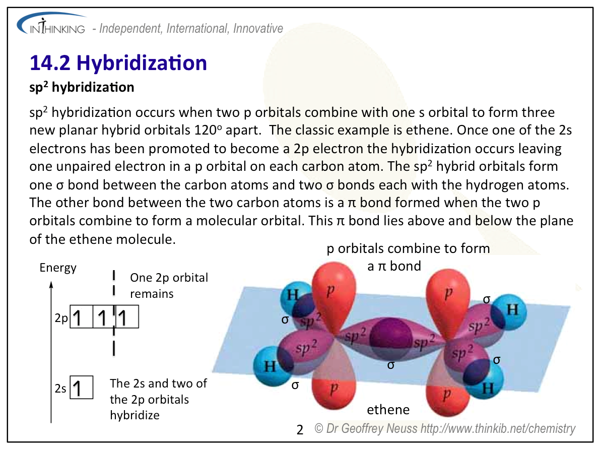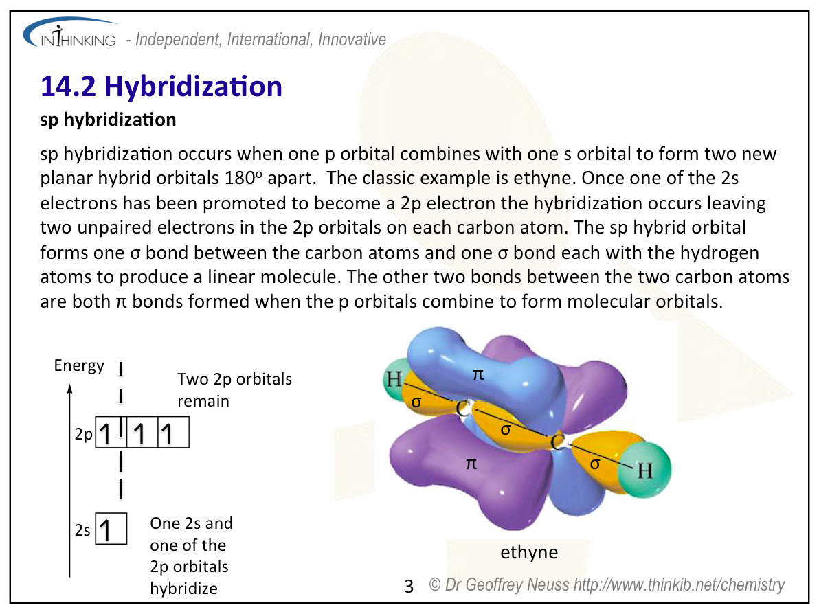 Slide 2 in the gallery explains why organic compounds containing three electron domains have a bond angle of 120o as now the hybridization is sp2, i.e. three hybrid orbitals are formed from the s and two of the three p orbitals. The remaining p orbital is free to form a π bond with the p orbital of the bonding atom at right angles to the plane of the sigma bonds. This occurs in alkenes and carbonyl compounds such as aldehydes and ketones. In compounds where the central carbon atom has two electron domains the bond angle will be 180o and the two hybrid orbitals are formed from one s and one p orbital to give sp hybridization. This leaves two p orbitals which can each form a π bond with the p orbitals on the bonding atom. This occurs in carbon dioxide, alkynes and nitriles (see Slide 3). It also occurs in carbon monoxide where one of the sp hybrid orbitals on both the carbon and oxygen atoms contains a non-bonding pair of electrons and the other forms a σ bond between the carbon and oxygen atoms along with two π bonds to form the triple bond.