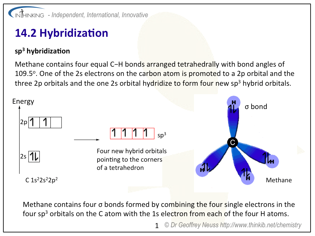 To understand hybridization it is best to start by considering the bonding in methane. Each of the four hydrogen atoms has the electron configuration 1s1 and the electron configuration of carbon is 1s22s22p2. Carbon contains four outer electrons, two paired together in the 2s orbital and one each in two of the three 2p orbitals. It is not easy to see how these can form four sigma bonds without the unpairing of the two 2s electrons nor why the shape of methane is tetrahedral as the p orbitals are orthogonal (at right angles) to each other. The mixing of atomic orbitals to form new hybrid orbitals with their own properties (e.g. energy and shape) is known as hybridization. When the carbon atom bonds in methane the 2s orbital and the three 2p orbitals hybridize to form four new hybrid orbitals. This is known as sp3 hybridization and the four new hybrid orbitals, which each contain one unpaired electron, point towards the corners of a tetrahedron giving a bond angle of 109.5o. The electron in each of the sp3 hybrid orbitals is able to combine with an electron in the s orbital of a hydrogen atom to fill the four bonding sigma molecular orbitals leaving the antibonding orbitals empty resulting in four equal C−H sigma bonds. This is shown in slide 1 the gallery below which can also be found on the page on the sub-topic on 14.2 Hybridization.