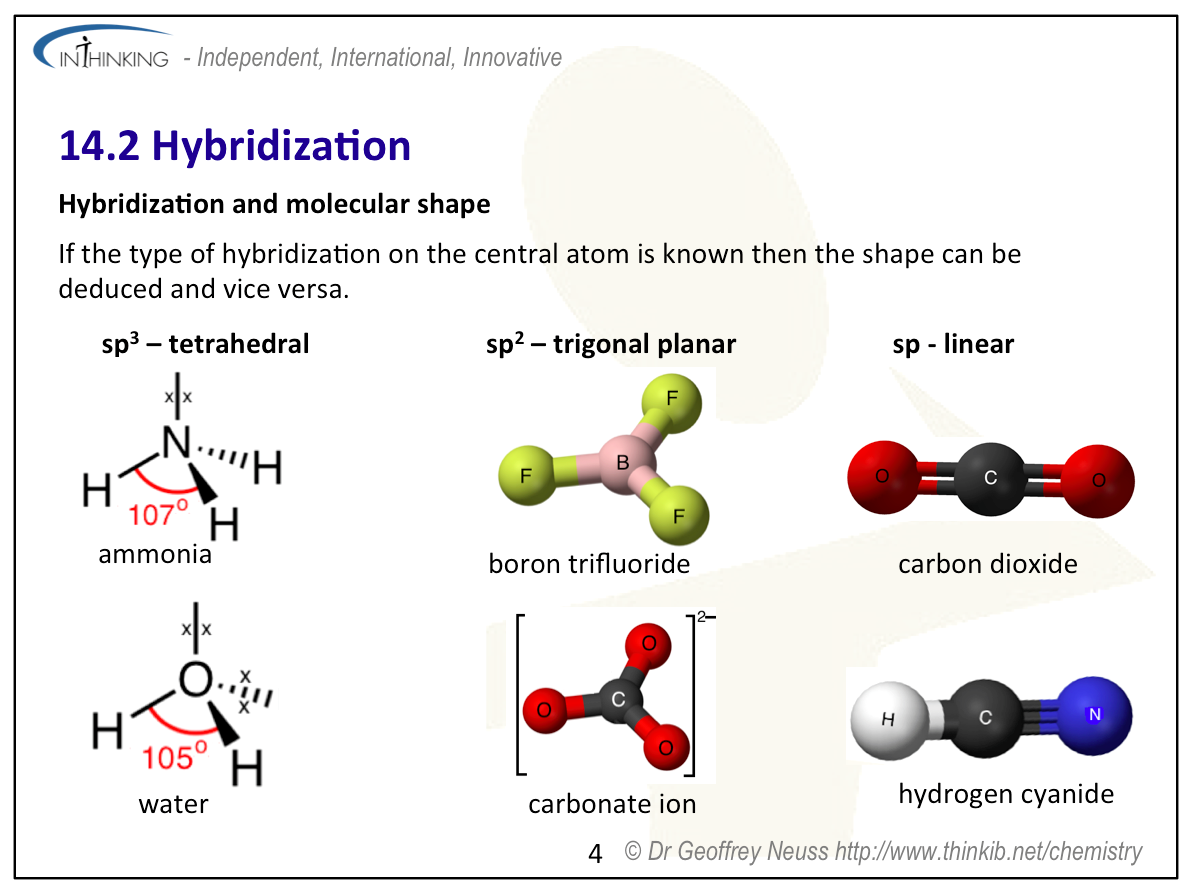 Once the type of hybridization is known the shape and hence the bond angle(s) can be predicted. For example the central carbon atom in compounds with four bonding pairs of electrons around the central atom will all be sp3 hybridized so will all have a regular tetrahedral shape with a bond angle of 109.5o. Examples include CH4, CCl4 and CHCl3. Where one of the four electron domains is a non-bonding pair of electrons the ‘parent’ shape will be tetrahedral but the actual shape will be trigonal pyramidal with bond angles slightly less than 109.5o. An example is NH3 with a bond angle of 107o. The bond angle will be even less when two of the electron domains contain non-bonding pairs of electrons to give a bent molecule, e.g. H2O with a bond angle of 105o.