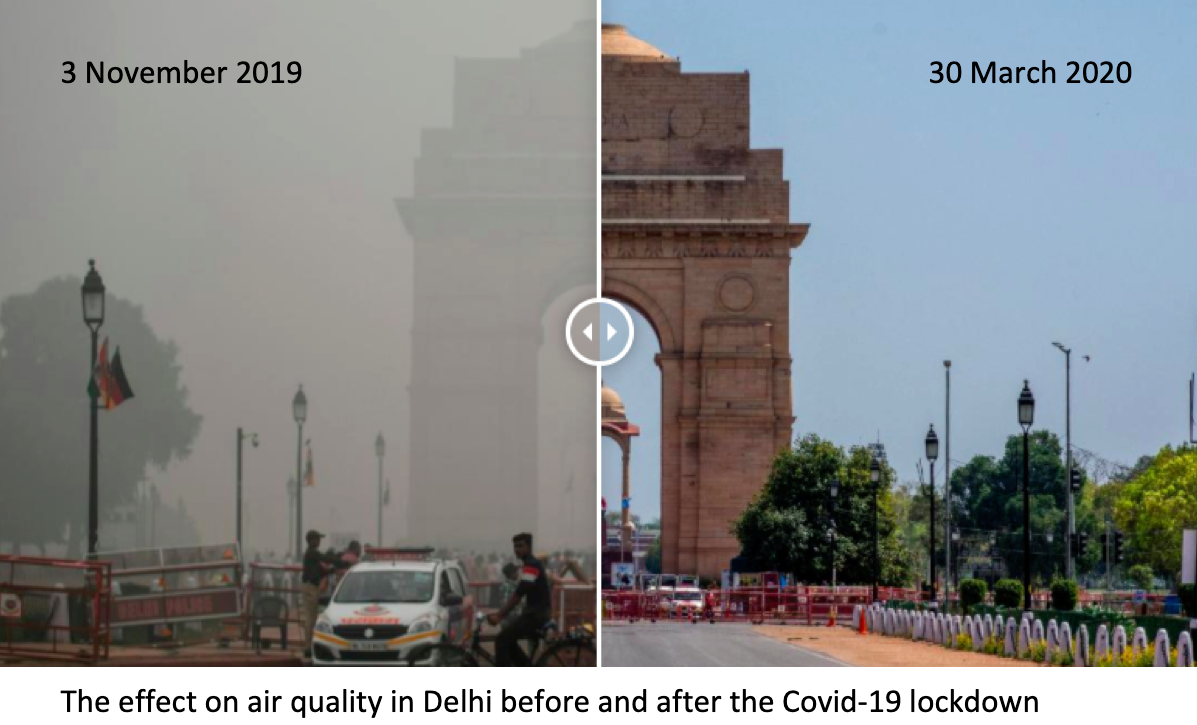 There is now a lot of data on how nitrogen dioxide levels have changed since the lockdown due to Covid-19. For example see the World Health Organization fact sheet and also an article on CNN from which the two images of Delhi, one on 3 November 2019 and the other on 30 March 2020 were taken.