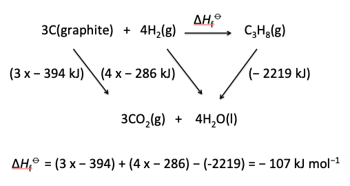 In the same way that the Chemistry guide can be analysed so can the current IB data booklet. For example, in Section 2 the ionic product of water at 298 K has units of mol2 dm-6 whereas the values for the ionization constants for water in Section 23 and the values for solubility products in Section 32 have no units. Even though no uncertainties are given the values in different sections sometimes do not match. For example in Section 12 the enthalpy of formation of propane is given as − 105 kJ mol−1. Hess's Law can be used to calculate this value using the enthalpies of combustion for graphite, hydrogen and propane in Section 13. These values are given as − 394, − 286 and − 2219 respectively. Using these values ΔHf⦵(propane) = (3 x − 394) + (4 x − 286) − (−2219) = − 107 kJ mol−1 which is not the same as the value given in Section 12.