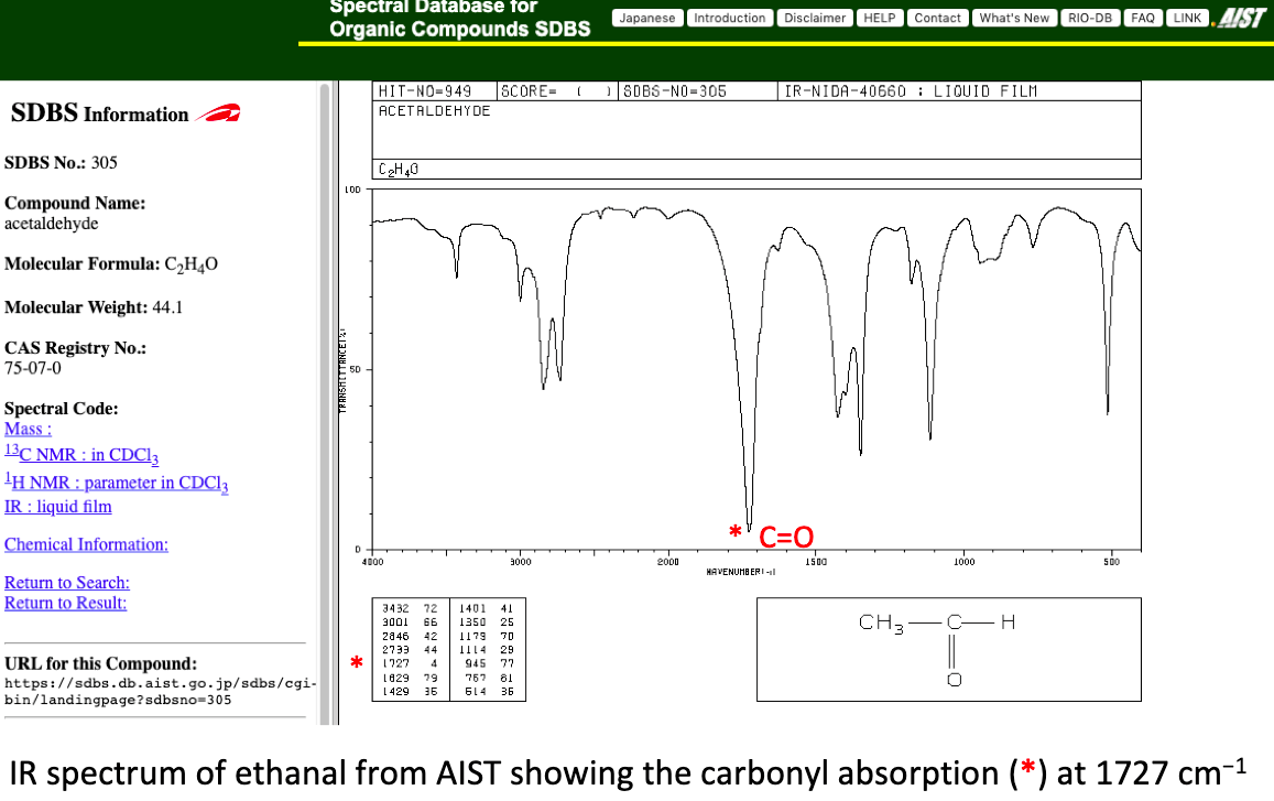 For example, the IR absorption due to the carbonyl group is particularly sharp. The IB data booklet gives a value of between 1700 and 1750 cm−1.