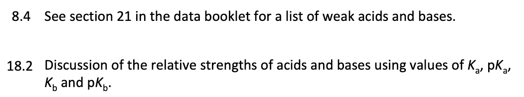 SL students are directed to a table in the data booklet that lists the pKa values of various acids but neither Ka nor pKa are on the SL syllabus. They are covered in the AHL sub-topic 18.2.