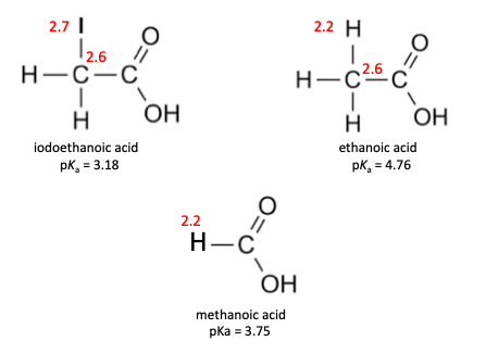 Iodoethanoic acid has a pKa of 3.18. Iodine has an electronegativity value of 2.7 making it virtually the same as carbon (2.6). If the iodine atom is substituted by a hydrogen atom (electronegativity value 2.2) then the resulting acid, ethanoic acid is considerably weaker with a pKa value of 4.76. This is said to be due to the positive inductive effect of the methyl group. What is surprising is that if the methyl group itself is substituted by a relatively electropositive hydrogen atom to give methanoic acid it might be expected that the acid would be even weaker (as the electronegativity of the atom bonded directly to the carboxylic carbon atom has decreased from 2.6 to 2.2) whereas in fact the pKa of methanoic acid is 3.75. This means that methanoic acid is ten times stronger than ethanoic acid.