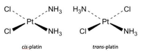 The IB syllabus only really covers examples of stereochemistry in organic molecules but inorganic molecules can also show stereoisomerism (see the HL page on Coloured complexes). These can have interesting and unique properties, for example: Why is cis-platin effective against certain cancers whereas trans-platin is not?